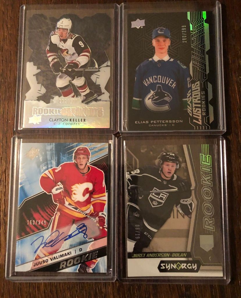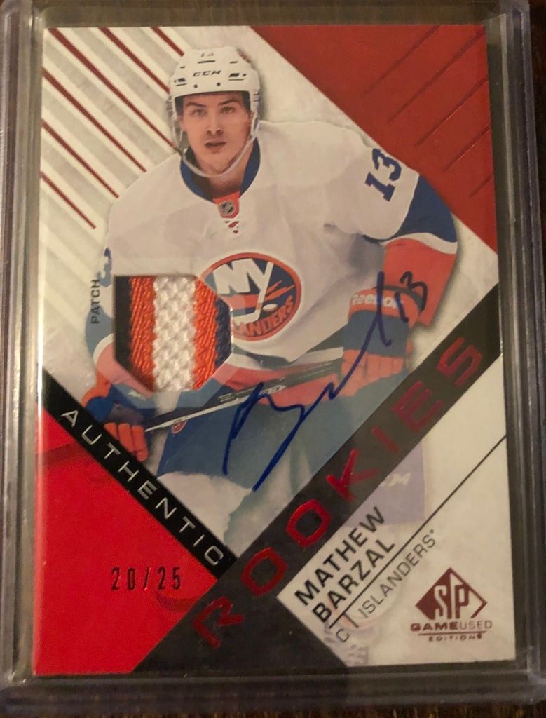 The Barzal has a soft corner on the top left that I have pictured, UD has said that will either fix or replace if you want to go that route. Dolan is a true rookie /19 and the Keller is 9/100 jersey number. Again shoot over an offer if interested. ![]() ![]()