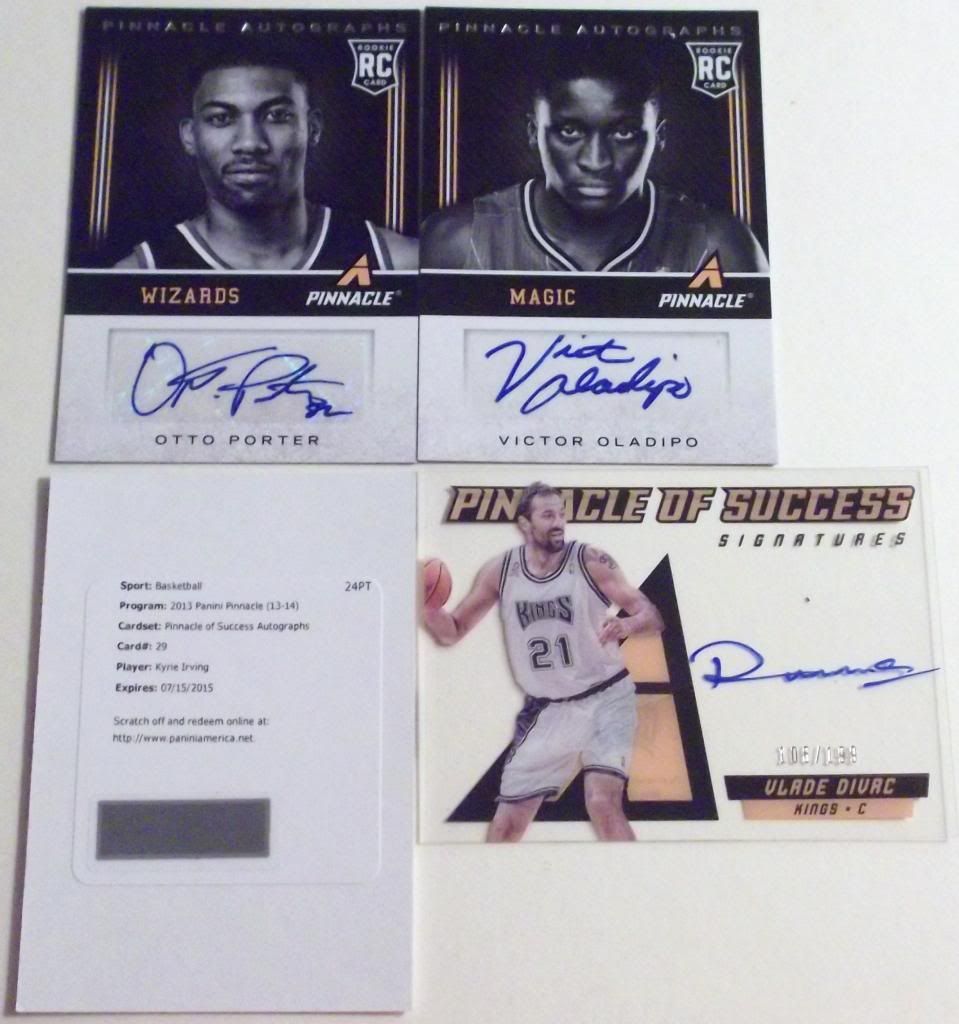 Pinnacle Autos: Victor Oladipo Otto Porter Jeff Ayres Darrell Walker Glen Rice Jr Sidney Moncrief Ish Smith Essence Of The Game Acetate Auto: Andrew Blatche /199 Pinnacle Of Success Acetate Autos: Joakim Noah Redemption /99 Vlade Divac /199 Kyrie Irving Redemption /99 Upstarts Rookie Jerseys: Isaiah Canaan Tony Snell Dennis Schroder Performers Jerseys: Deron Williams Kevin Love #'d Inserts: Ray Allen Awaiting The Call Die-Cut /99 Chris Bosh Artist Proof Awaiting The Call /25 Darryl Dawkins Jamfest Die-Cut /99 Chandler Parsons Team 2020 /99 ![]() Last edited by Tylerg30; 01-16-2014 at 09:54 PM. Reason: misspelled title |