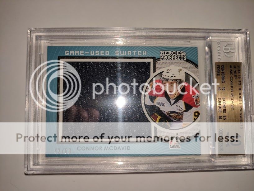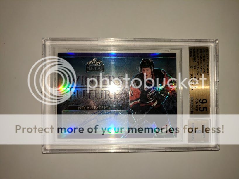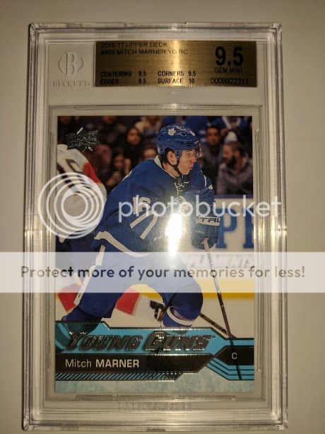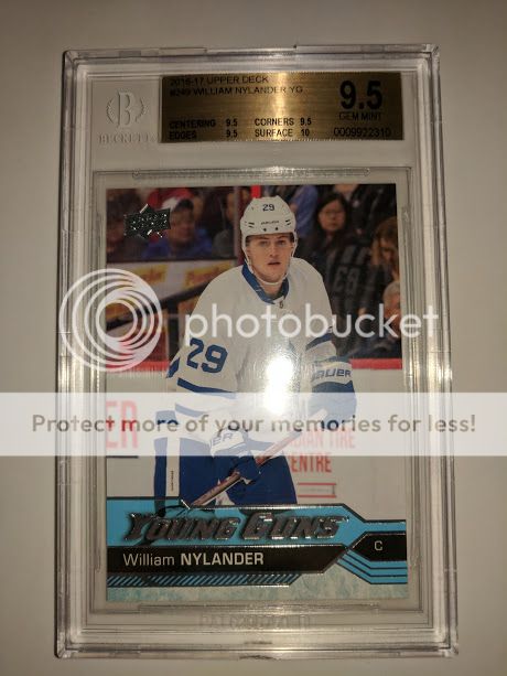 2017 Leaf Metal Nolan Patrick Winter's Future purple /10 BGS 9.5 ![]() (not Hockey) 2015 Panini Prizm Draft Picks Purple Tom Brady /99 BGS 9.5 ![]() 2015-16 OPC Update Jack Eichel RC BGS 9.5 ![]() 2016-17 UD Series 1 Young Guns William Nylander BGS 9.5 ![]() 2016-17 UD Series 2 Young Guns Mitch Marner BGS 9.5 ![]() 2014-15 Leaf Heroes and Prospects Game Used Jersey Connor McDavid /50 BGS 10 ![]() ![]() ![]() 2015-16 UD Series 2 Jack Eichel Young Guns BGS 10 ![]()