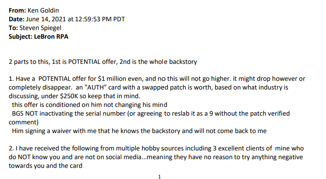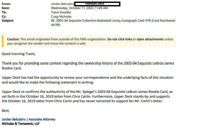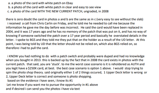 In one of the prior updates from March of last year, there was a copy of an email from Ken Goldin that mentioned Upper Deck and Chris Carlin (UD) said their letter of support was incorrect and shouldn't be relied upon. As usual, Paul Lesko does a great recap, if you wanted to read everything (discovery dispute) but relating to Upper Deck's opinion, this note from UD's attorney suggests either Ken was incorrect or UD has flipped yet again. Maybe the cardporn connection is swaying opinions? Would be nice if someone could track down one of the original owners and maybe settle the swap/shop(photo) debate. https://x.com/Paul_Lesko/status/1763...425794800?s=20