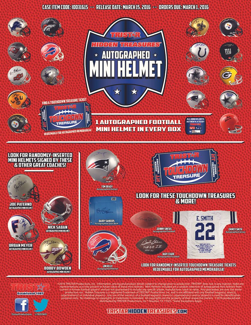 Below you will find the most up-to-date product information available. Our goal is to compile as much information within this THREAD regarding this product as possible. Throughout the Pre-sell process, we will update this thread with any content changes, videos/images, or any other manufacturer announcements that are made before the product is released. Once the product comes live, this thread will also be a great resource for break and content information. Blowout Cards offers two ways to Pre-Order New releases! If you would like to pre-order this product in full, you may do so by purchasing box and/or case pre-orders on our website. We also offer our customers the option of locking in on ANY pre-sell case price with only a $200 deposit per case! By doing so, you are reserving a case at the current pre-sell pricing. The balance of the case price will be due when the product is shipped. Please email Chris@blowoutcards.com for details. Attention Multi-Case and Group Breakers! If you are looking to purchase multi-case lots (2+,5+, 10+ Cases), Blowout Cards will do our best to earn your business! Simply email Chris@blowoutcards.com for our multi-case break pricing! (Excludes Panini Mapp Products). Thanks again for your continued business. Chris Please click the links below to purchase this product by the Box or Case CASE 2016 Tristar Hidden Treasures Football Mini Helmet 10 Box Case BOX 2016 Tristar Hidden Treasures Football Mini Helmet Box 2016 Tristar Hidden Treasures Autographed Mini Helmets Football