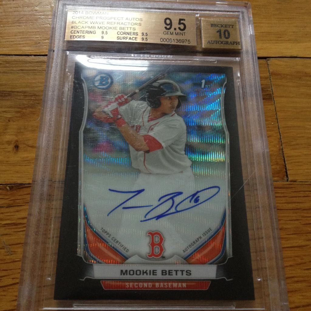Hey guys, I'm selling a Mookie Betts 2014 chrome black wave auto /50 BGS 9.5/10. The price is $799.99 OBO, and I'm flexible on the price. The raw version sold for $495 this morning, so I'm not really sure where to price the raw. Please PM me if you have interest.
