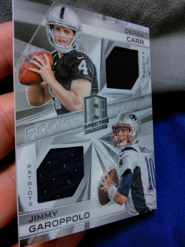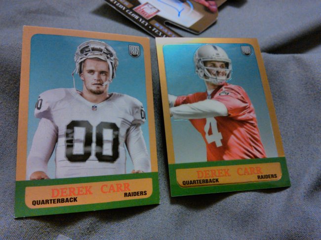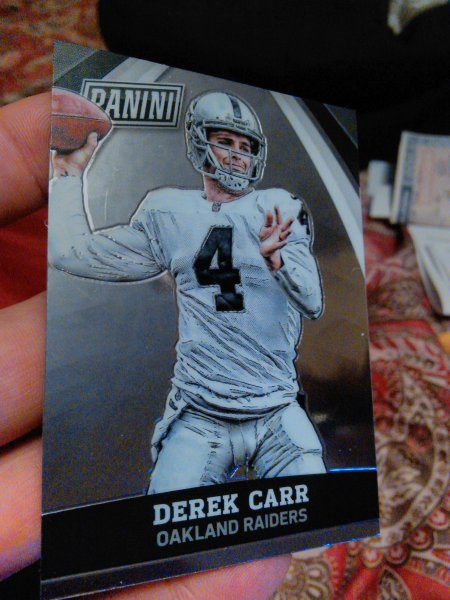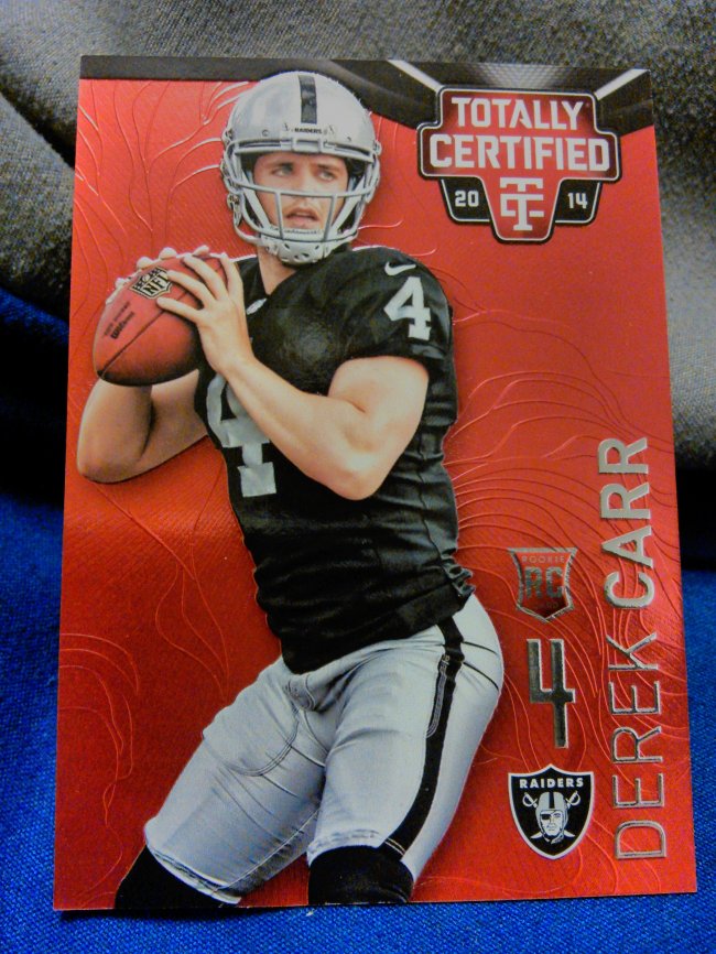 ***SOLD*** Hey everyone, This lot consist of a few of my extra Derek Carr PC. Price includes Shipping! Please Claim on thread, and if possible send me a PM afterwards. $25 dlvd - Thank You Derek Carr 2015 Panini Luxe 2 Color Jersey 09/49 2014 Topps Mini (Both cards pictured) 2015 Panini National Derek Carr VIP Party Gold Packs 2014 Panini Spectra Derek Carr/Jimmy G. Rookie Combo Jersey 169/199 2014 Bowman Chrome Franchise Futures PSA 9 2014 Panini Absolute RC Quad Relic 044/249 2014 Totally Certified Platinum Red RC Parallel #ed/100 2014 Topps Platinum Rookie XFractor ![]() ![]() ![]() ![]() ![]() ![]() ![]() ![]() ![]()