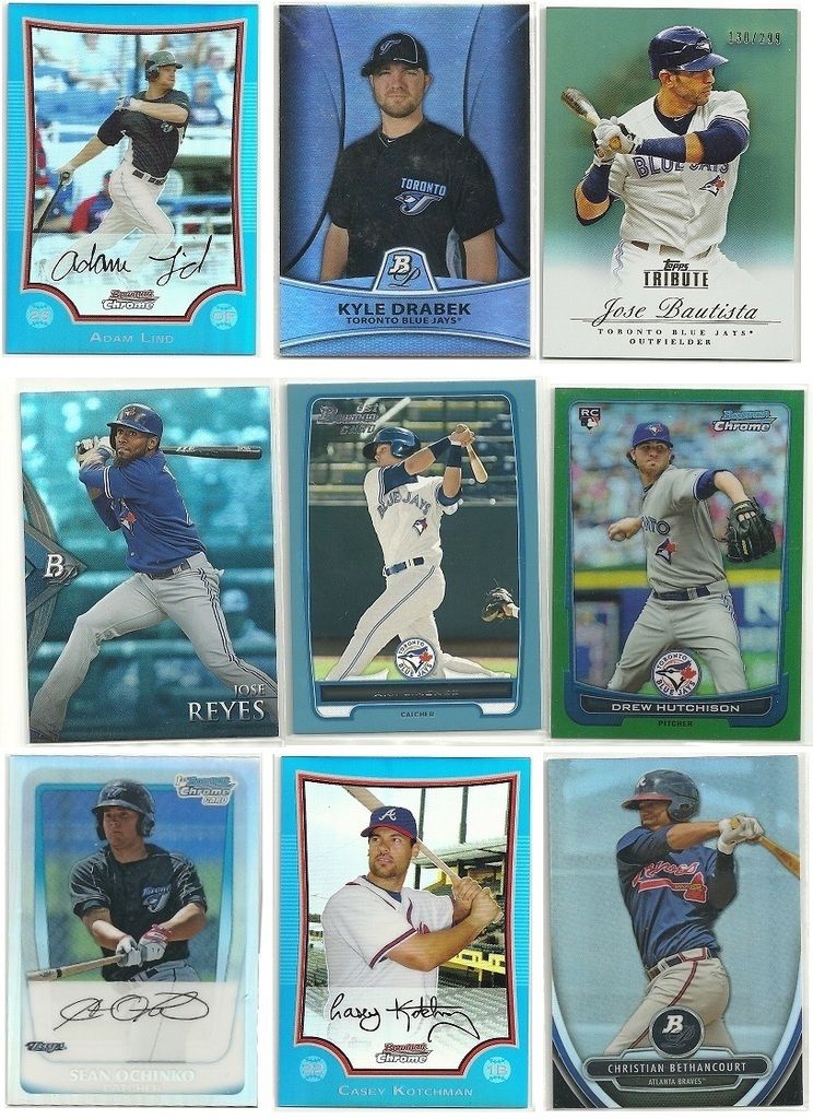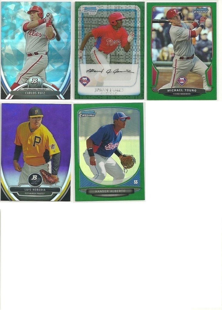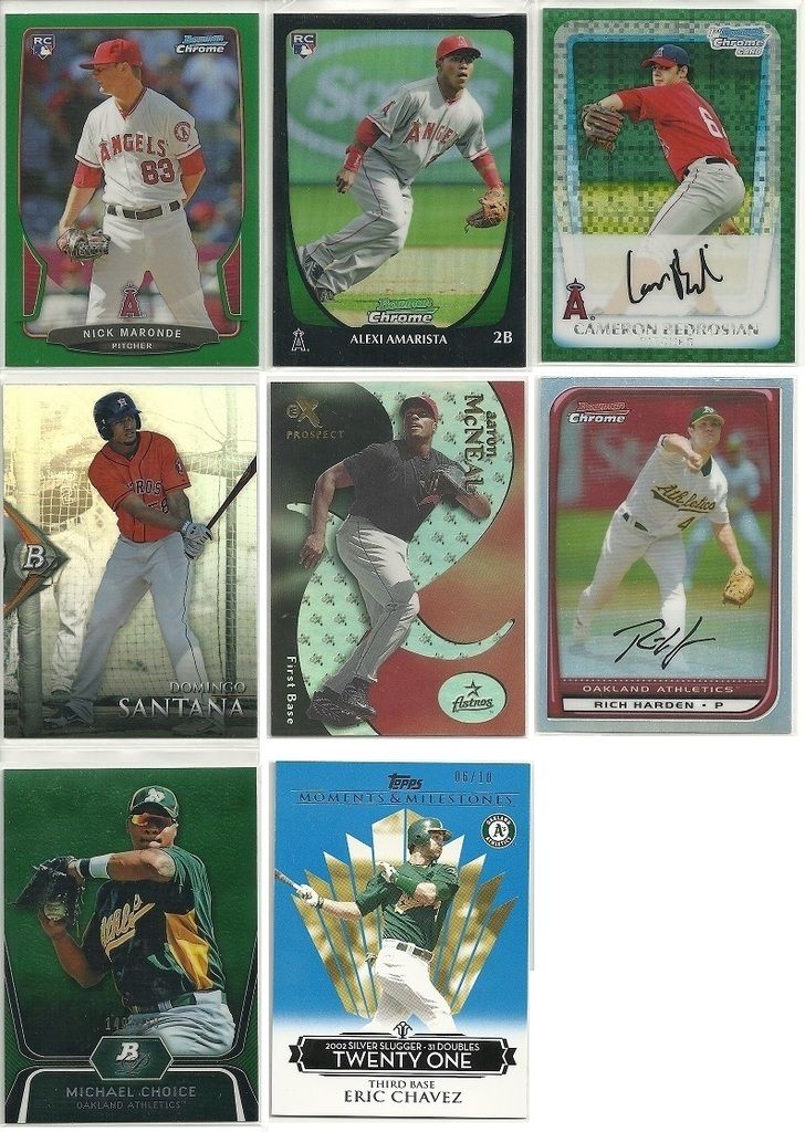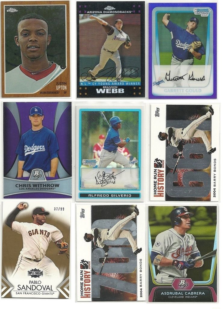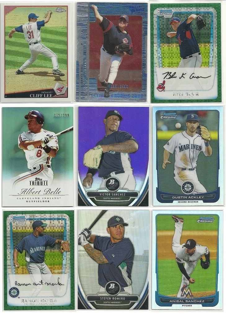 Shipping 1-2 cards: $1.00 PWE 3-10 cards: $3.00 10+ will be calculated accordingly EVERYTHING BELOW IS $0.25 EACH UNLESS NOTED TAKE EVERYTHING (minus stars at bottom) FOR $25.00 DLVD ![]() Choice Green Refractor: $0.50 Chavez Blue: $2.00 ![]() Bautista: $1.00 ![]() Jungmann Mini Blue Refractor: $0.50 ![]() Upton Heritage Chrome: $0.50 Bonds HR History: $0.50 each Sandoval: $1.00 ![]() Belle: $0.50 ![]() Espinosa: $1.00 Zimmerman: $1.00 Morse Refractor: $1.00 ![]() Sampson X-Fractor: $0.50 ![]() ![]() Michael Young: $1.50 ![]() ![]() Perez Gold: $0.75 ![]() Escobar Blue: $2.00 Molina Blue: $0.75 Dickerson Refractor: $0.50 O'Brien Purple Refractor: $0.50 Cards below are priced as listed ![]() 1998 Topps Mystery Finest Borderless Refractor #M16 - $6.00 1999 Pacific Paramount Personal Bests #7 - SOLD 1998 Upper Deck Unparalleled #8 - SOLD 1999 Skybox Thunder Rant #285 - $2.00 1998 Upper Deck Collector's Choice Starquest Double #SQ3 - $6.00 1998 Pacific Omega Red #34 - $6.00 1995 Score Rules #SR18 - $6.00 1997 Score Heart of the Order #12 - SOLD ![]() 2002 Fleer Tradition SP #2 - $6.00 (x2) 2006 Topps Rookie of the Week #14 - $0.50 each 2000 Fleer Tradition Ripken Collection #6 - $1.00 2000 Fleer Tradition Ripken Collection #7 - $1.00 2000 Fleer Tradition Ripken Collection #9 - $1.00 2000 Fleer Tradition Ripken Collection #10 - $1.00 2000 Skybox Dominion Eye on October #EO11 - $1.00 ![]() (x2) 1990 Bowman RC #320 - $1.00 each 1990 Score RC #663 - $1.00 (x2) 1990 Topps RC #414 - $1.00 each 1993 Score The Franchise #4 - $0.50 1995 SP Championship Series Die-Cut #140 - $0.50 1997 Upper Deck Collector's Choice Big Shots Gold Signature #10 - $4.00 1997 Upper Deck Collector's Choice Toast of the Town #T11 - $2.00 ![]() 1997 Donruss Franchise Features w/Darin Erstad #2 #'d 2183/3000 - $3.00 1997 Donruss Power Alley #1 #'d 0387/1000 - $15.00 1997 Donruss Rocket Launchers #1 #'d 4076/5000 - $2.00 1997 Donruss Rocket Launchers #1 #'d 4666/5000 - SOLD 1997 Fleer Team Leaders #4 - $2.00 1997 Leaf 22 Karat Gold Leaf Stars #1 #'d 1601/2500 - $8.00 1997 Leaf Fractal Matrix X-Axis Die-Cut #369 - $10.00 1997 Pinnacle X-Press Far & Away #3 - $1.00 1998 Pacific Omega Prism #4 - $2.00 ![]() 2006 Topps Opening Day Red Foil #45 #'d 0817/2006 - $2.00 2002 Fleer Diamond Standouts #DS8 #'d 0930/1200 - $2.50 1999 Fleer Tradition Diamond Magic #DM10 - $2.00 (x2) 1999 Fleer Tradition Golden Memories #GM8 - $1.50 each 1999 Topps All-Topps Mystery Finest #M33 - $1.50 1998 Topps Mystery Finest Bordered #M12 - $1.50 1997 Leaf Dress For Success #1 #'d 2382/3500 - $5.00 1997 Pinnacle Passport to the Majors #1 - $5.00 ![]() 2004 Fleer Tradition Career Tributes #CT2 #'d 1173/1993 - $5.00 1995 Upper Deck Collector's Choice Gold Signature #52 - $8.00 1994 Fleer Golden Moments #7 - $0.50 1993 Upper Deck Then & Now #TN5 - $0.50 ![]() 1999 Fleer Tradition Diamond Magic #DM8 - $2.00 1999 Skybox Thunder Hip-No-Tized #H6 - $2.00 1999 Fleer Sports Illustrated Diamond Dominators #DD3 - $2.00 1998 Ultra Gold Medallion Edition #217G - $0.50 1998 Upper Deck Amazing Greats /2000 #AG26 - $4.00 1996 Score All-Stars #11 - $2.00 1995 Donruss Press Proof /2000 #18 - $3.00 ![]() 1998 Pacific Paramount Team Checklists #14 - $1.00 1998 Ultra #492 - $0.50 1997 Donruss Dominators #11 - $1.50 1999 Upper Deck Crowning Glory w/Kerry Wood #CG1 - $0.50 1998 Donruss Dominators #1 - $2.00 1999 Pacific Team Checklist #14 - $1.00 (x3) 2002 Fleer Tradition SP #68 - $1.00 each ![]() 2003 Fleer Tradition Standouts #NA - $3.00 1999 Topps All-Matrix #AM25 - $0.50 2003 Fleer Tradition Black & White Goudey #9 #'d 1488/1936 - $2.00 1995 Topps Finest #185 - $0.50 1993 Score Select Aces #1 - $1.00 1995 SP Championship Series Die-Cut #122 - $0.50 1994 Fleer Smoke 'n Heat #1 - $1.00 1991 Fleer All-Star Team #10 - $0.50 1997 Leaf Die-Cut Fractal Matrix #40 - $5.00