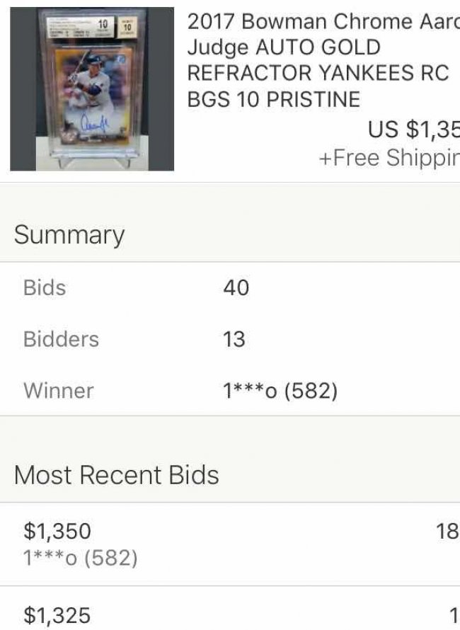 Sold this guy a 2017 Bowman Aaron Judge gold ref auto BGS 10 on July 17th. Received the item not as described claim this AM shortly after another BGS 10 did $1350. He paid a little more than 2x on the 17th.
