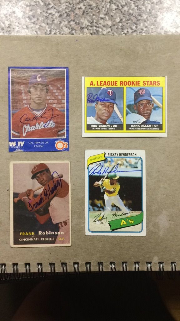 Definitely these! RCs of my favorite players. The Griffey has a story behind it and is the one card I haven't (even as a kid when the prices were $100+) and never will get rid of. I've always wanted the Ripken RC "to have" and just recently bought it. The Trout I bought for $12-15 in 2012 and just recently submitted...it makes me feel like I did something right with my life by holding onto it (lol j/k). Being in the military, I had to have the Tillman and recently submitted it. I wanted it so I could tell my son what a true patriot and hero he was...how someone can do what he did is amazing to me. The Griffey Power Alley was my favorite insert growing up. I had a Frank Thomas but sold it and wanted the Griffey instead. AND...cards that I need to get graded, RCs of all 5 Ohio State Heisman Winners! No, not a ton of value here, but they will all be displayed in my future man cave.