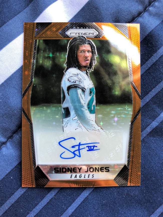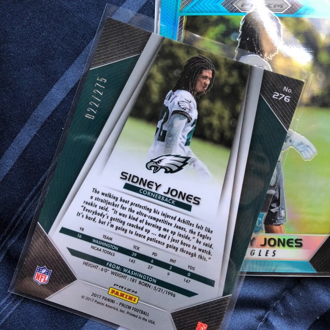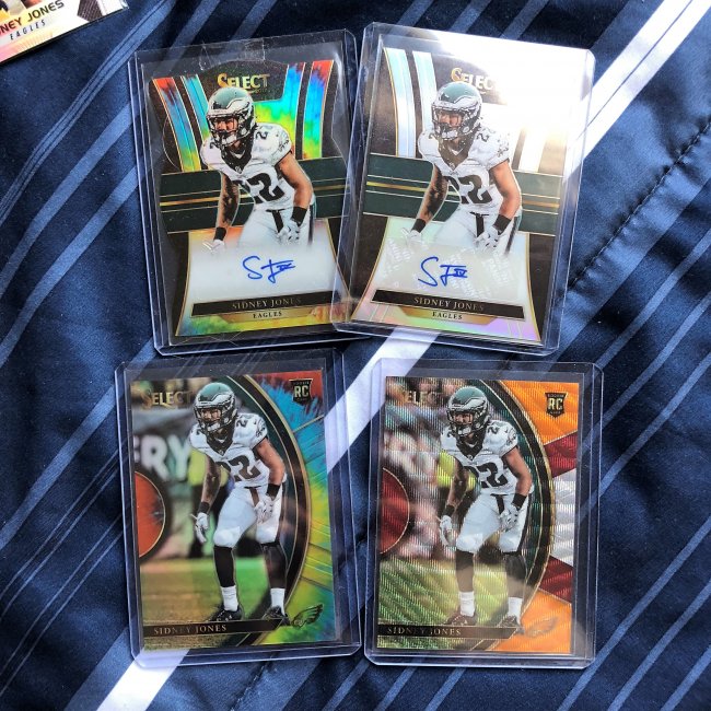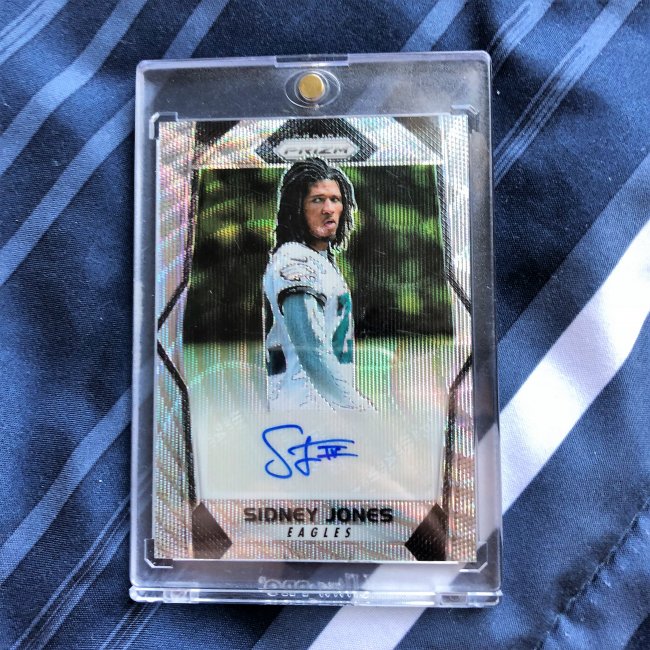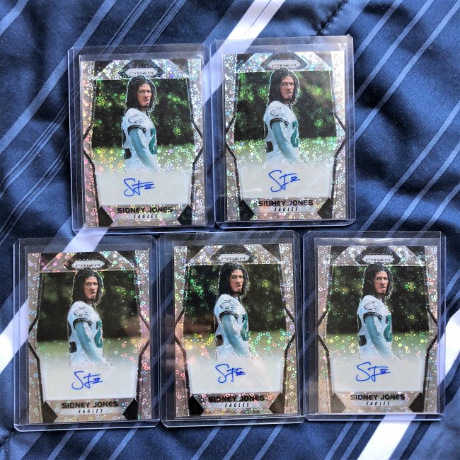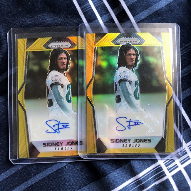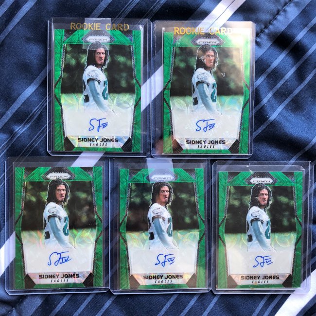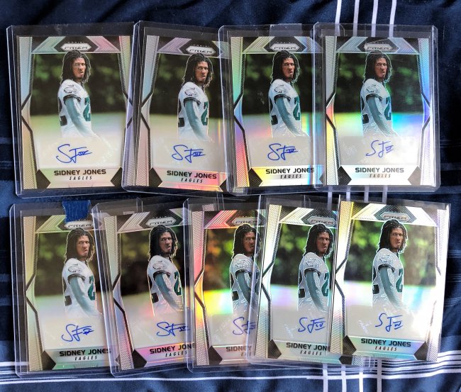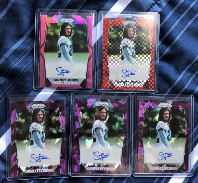 Really sick today (called off work) and have been meaning to post some showoff thread stuff. Here is a bunch of my Eagles / Sidney Jones Prizm collection. Enjoy! (ps: sorry for the glares and tape)