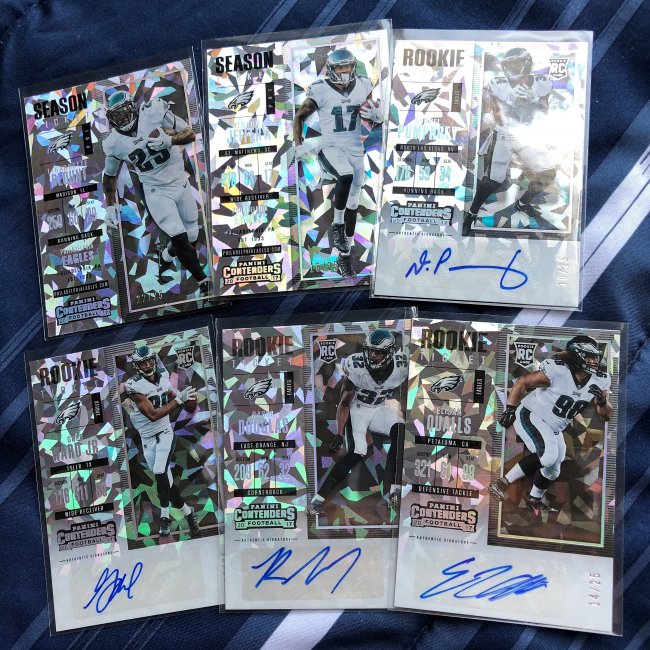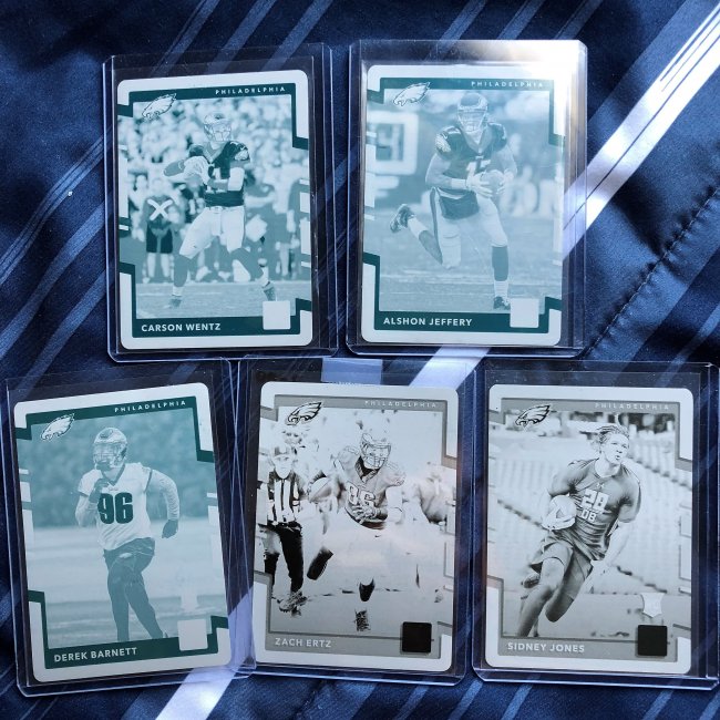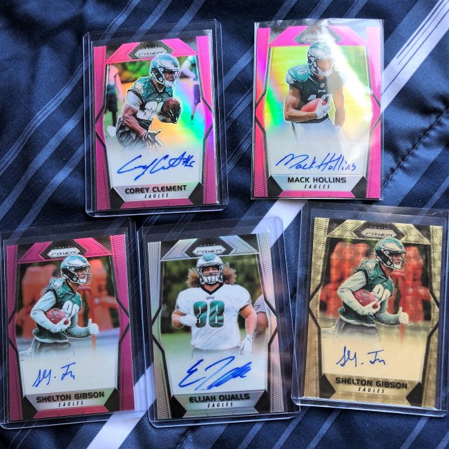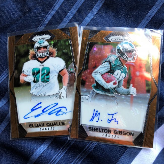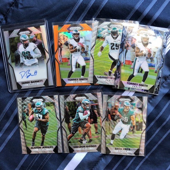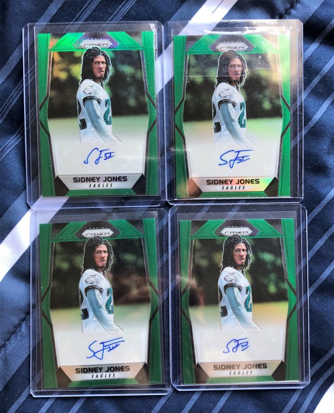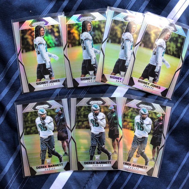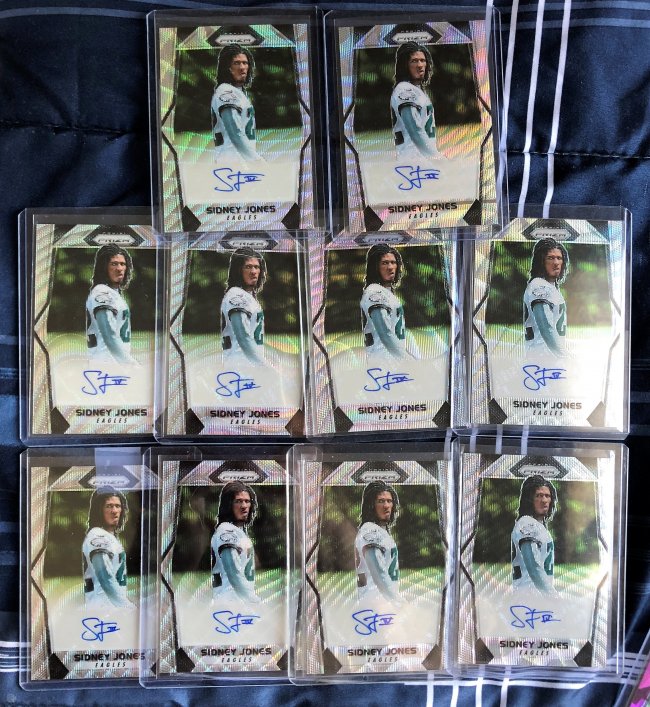 Really sick today (called off work) and have been meaning to post some showoff thread stuff. Here is a bunch of my Eagles / Sidney Jones Prizm collection. Enjoy! (ps: sorry for the glares and tape)