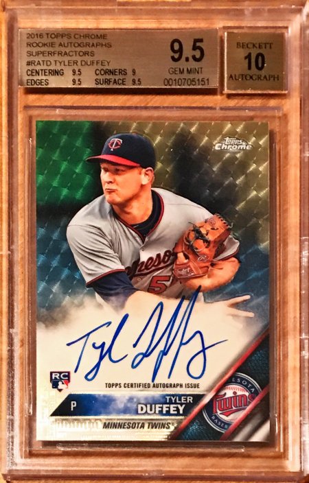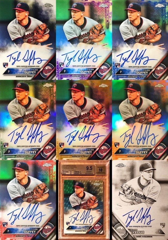 First up, happened to be browsing eBay fairly soon after this one was listed. Probably should have just hit the BIN, but I made an offer and a half hour later it was headed my way. Really difficult for scans to do this justice, this thing is sweet! 2011 Bowman Chrome Canary Anniversary Refractor 1/1 of Michael Cuddyer One 1/1 in a weekend would have been sweet, but as it turns out, this weekend brought me two! After working on the Tyler Duffey 2016 TC RC auto rainbow, I'm stoked to have added a pretty big one! Very glad I noticed it on eBay as it was just a 24-hour auction. Knew I couldn't let this one slip by. Duffey's not the greatest player out there, but I've been chasing these for several years now so it has a special place in my collection. Somehow, I haven't added a refractor auto yet, but other than that (+3 plates), this rainbow is just about wrapped up! Not a bad 2 days at all