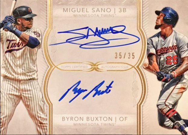 Couple closer scans of the gold and better- ![]() ![]() ![]() Next are a couple autographs. Each one cost me less than 5 bucks, I think. Kinda crazy how cheap Dozier's stuff is right now. I haven't entirely taken advantage, but plan on picking up several more before the season. In particular, he has framed autos in the latest Museum Collection set that are really nice, that's something that's on my list for sure Then there's a gold and 2 oranges. Buxton /50, Dozier and Morneau each /25. Love finding nice, cheap color- And finally, I got this awesome dual auto for less than 15 bucks. Found it a few minutes before it ended and brought it home. I'm a buyer all day at that price, this is a super nice looking card. Obviously both haven't exactly lived up to expectations yet, but the ceiling is still sky high for both. Hopefully this is the year!