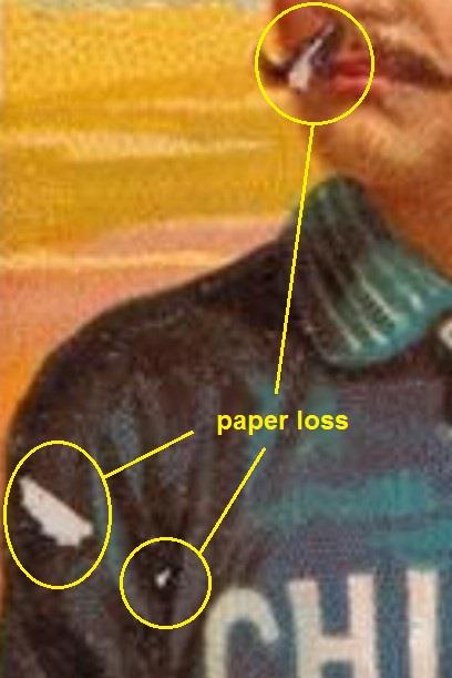 Edit #2: In the printing process (especially with coated stock which is what this is) it is not uncommon to have ink tack pull bits of the coating off as the sheet travels through the press blankets. The combination of blanket pressure, ink tack and poor quality paper can cause this. In printing we call the imperfections in paper slime holes. Slime holes pull off and eventually lead to paper trash on plates that lead to print spots (hickies). For the one sheet that has a paper coating pull off the result looks exactly like the card shown. Without the card in hand the actual conclusion as to what caused the area of concern is speculation. The card has been altered regardless.