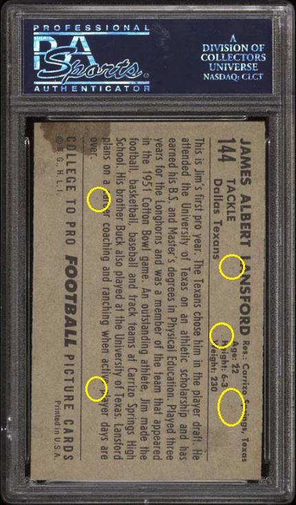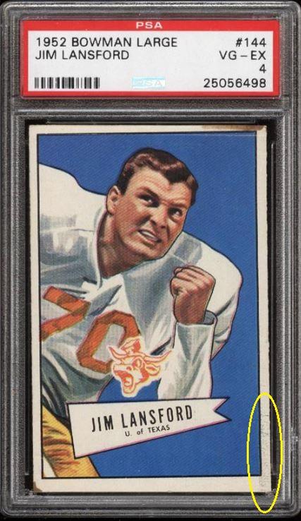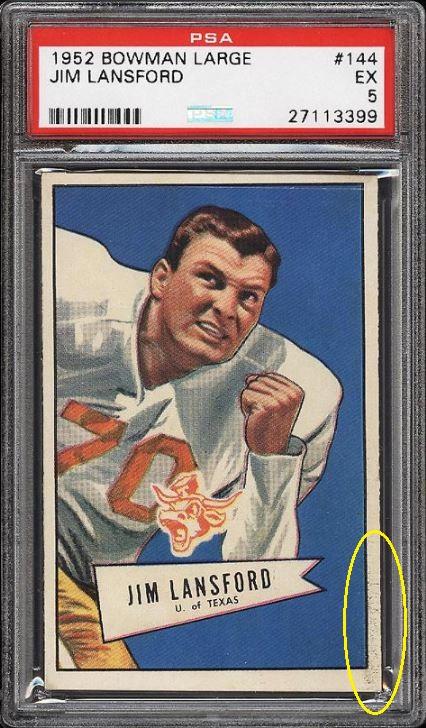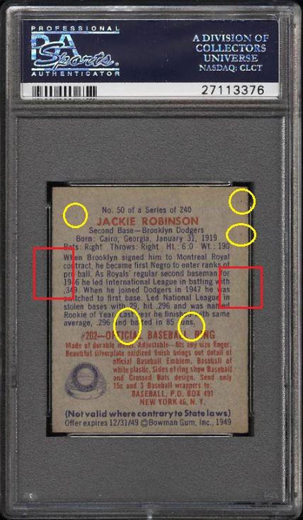 1949 Bowman Jackie Robinson RC #50 Value gain of $1,097.81 This card was sold by PWCC to whitman111 (Gary Moser) as a PSA-6 on December 04, 2016 for $2,025.00. PWCC Marketplace link: https://www.pwccmarketplace.com/items/1390849 Same card was sold by PWCC as a PSA-7 for $3,122.81 on March 11, 2018. PWCC Marketplace link: https://www.pwccmarketplace.com/items/1619533 Yellow circles are fiber or print mark identifiers. Red square show edge trimming. Red circle notes where color has been added. ![]() ![]() ![]()