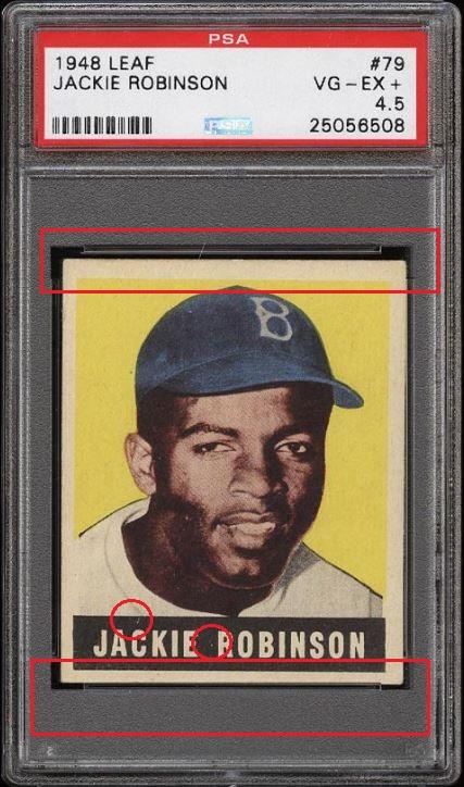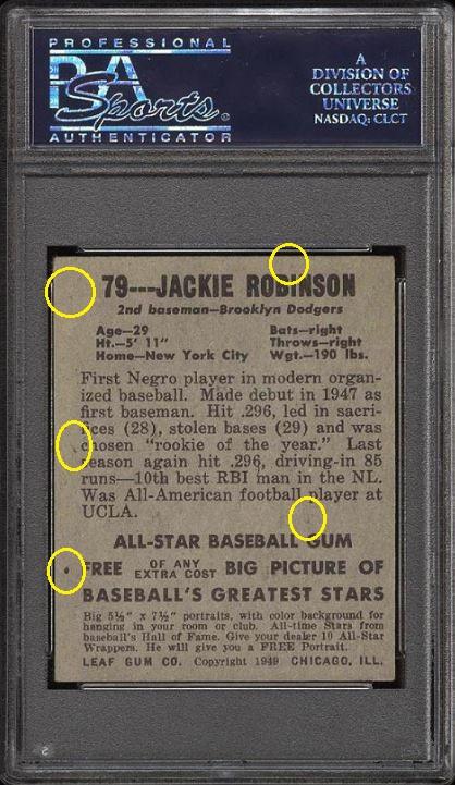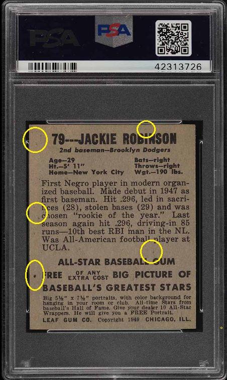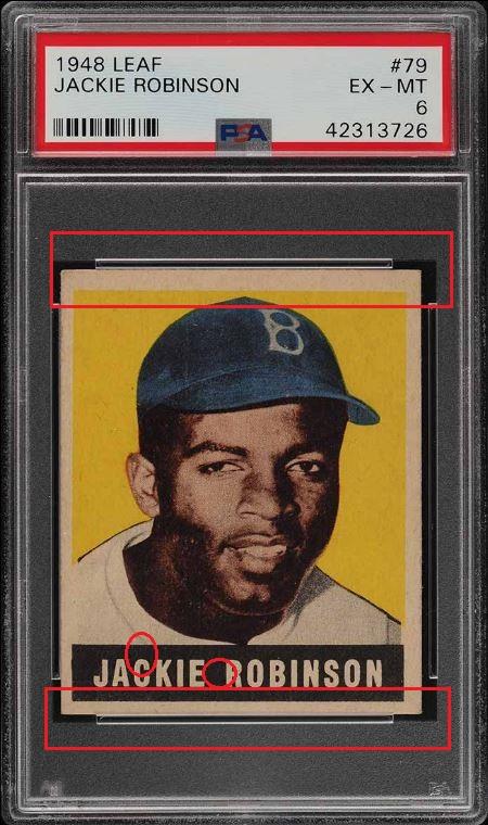 1948 Leaf Jackie Robinson RC #79 Value gain of $8,324.00 This card was sold by PWCC to whitman111 (Gary Moser) as a PSA-4.5 on December 04, 2016 for $3276.00. PWCC Marketplace link: https://www.pwccmarketplace.com/items/1390834 Same card was sold by PWCC as a PSA-6 for $11,600.00 on March 12, 2019. PWCC Marketplace link: https://www.pwccmarketplace.com/items/1923092 More vomit from the listing description: "This card screams quality with it's glowing yellow background, virtually zero excess print and flawless registration. The edges are perfectly maintained with out chipping and the borders are immaculate. The card possesses wonderful framing and four minimally EXMT corners to boot. All told, this is a tremendous example of an absolutely iconic rookie card. As investors continue to aggressively target this premier commodity the value of this card seems poised to soar over the coming years." Yellow circles are fiber or print mark identifiers. Red squares show edge repair and/or trimming. Red circles note where color has been added. ![]() ![]() ![]()