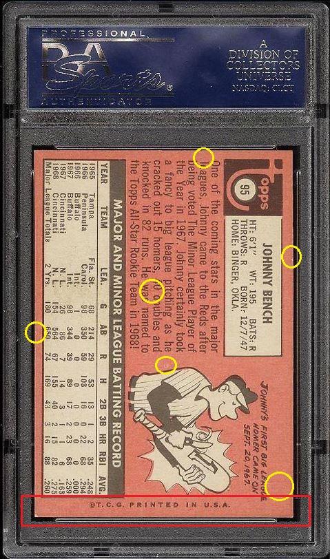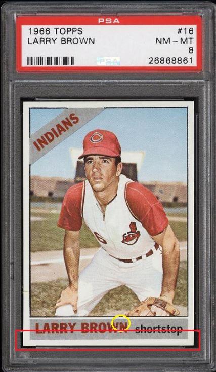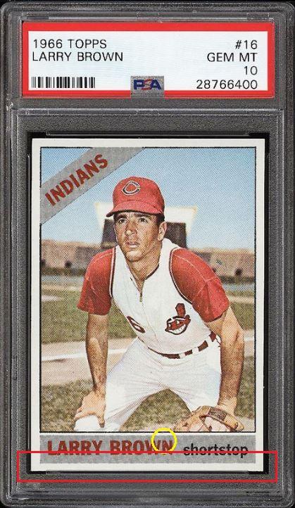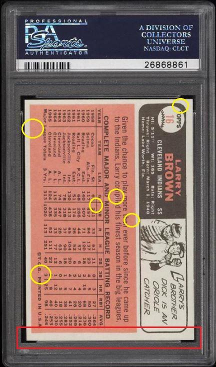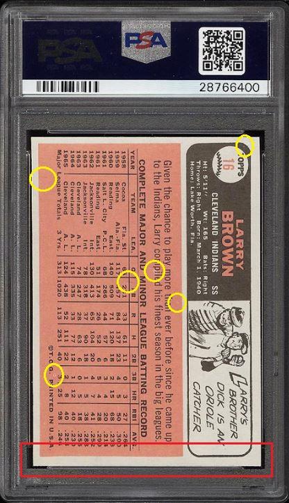 1966 Topps Larry Brown #16 - Population 1 of 3 Value gain of $346.32 This card was purchased by Ebay ID card-buyer from PWCC (Brent and Betsy Huigens) as a PSA 8 for $8.68 on July 10, 2017. PWCC Marketplace link: https://www.pwccmarketplace.com/items/1515052 Same card was sold by PWCC (Brent and Betsy Huigens) as a PSA 10 for $355.00 on April 16, 2018. PWCC Marketplace link: https://www.pwccmarketplace.com/items/1641218 Yellow circles are print, fiber, or chipping identifiers. Red box identifies trimmed bottom edge. ![]() ![]() ![]() ![]() ![]()
