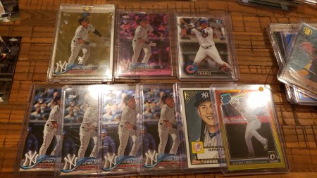 If you want something cheap pick up a us200 But there are lots out there. If you want something more rare and i feel with a lot more meat left on the bone pick up something better depending on your budget. I personally think the next cards to take off will be the heritage chrome and refractors. with the heritage you get a beautiful throwback card with he chrome being serial # /999 and the refractor /569. Prob the most undervalued of any rookie right now, i mean if gleyber us200 is selling for $10 each and there are 100,000 of them then you have a heritage chrome #/999 selling for $30...... seems kinda off but if money is no object my top list would be 1. Heritage black refractor #/69 2. Update us200 black #/67 3. Update Independance day #/76 4. Heritage refractor #/569 5. Heritage chrome #/999 Just my opinion for non auto rcs. |