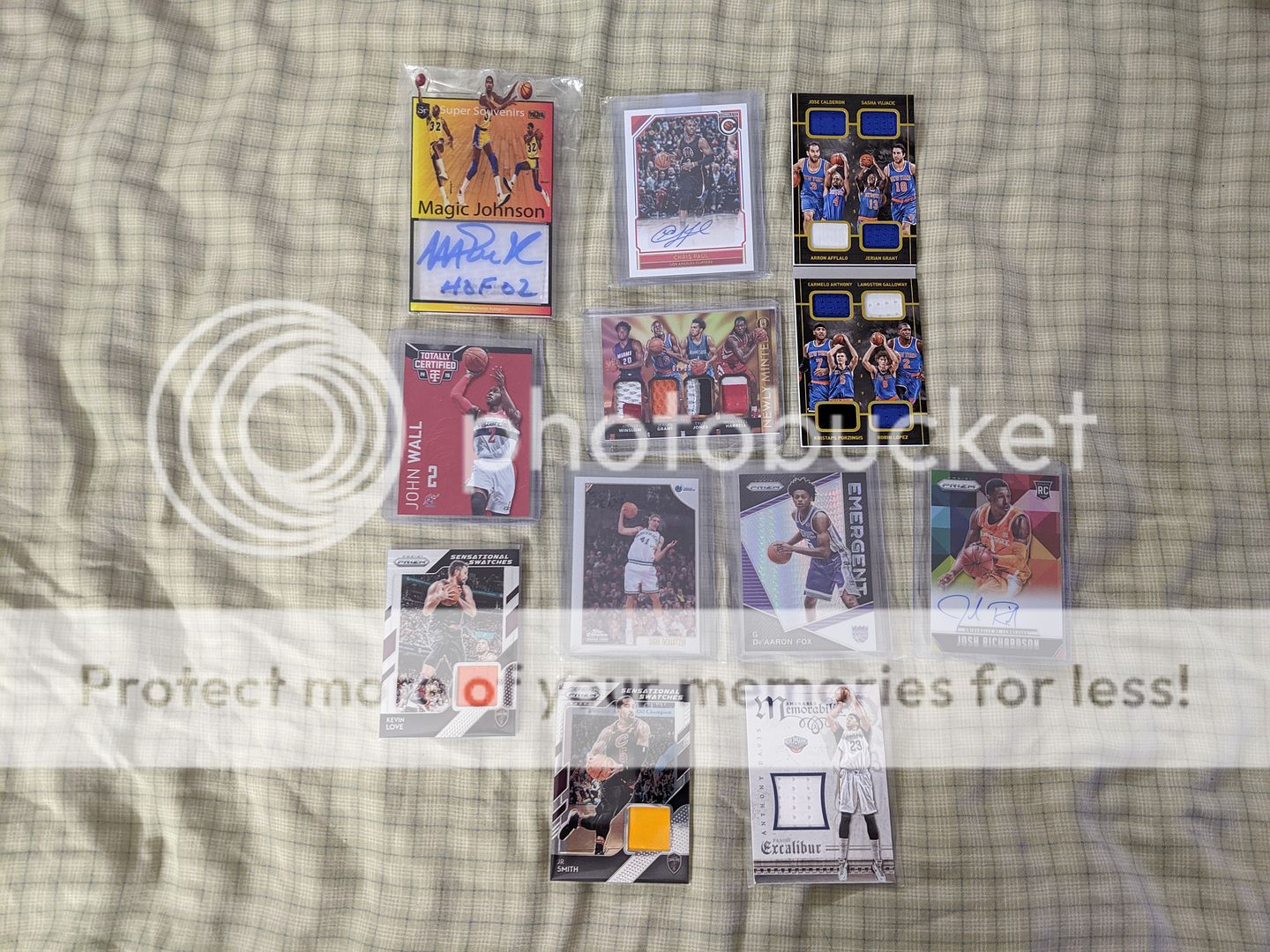 ![]() Hey guys, I thought I'd make a quick little preseason hoops lot for your viewing pleasure. Asking 110$ shipped on the group via Priority Mail.. You will get everything listed/pictured, all are in near mint or better condition and will be shipped well packaged.. First to claim them gets em.. Thanks for the look 2016-17 Super Break Magic Johnson Oversized Auto HOF02 inscription 2016-17 Panini Complete Chris Paul Veteran Auto SP 2015-16 Panini Preferred Crazy 8s New York Knicks Jersey Relic Booklet /149 (Mello, Porzingis) 2014-15 Panini Totally Certified John Wall Red SP /249 2015-16 Panini Gold Standard Quad Rookie Patch /25 (Tyus Jones, Montrezl Harrell, Jerian Grant, Justise Winslow) 1998-99 Topps Chrome Dirk Nowitzki Rookie 2017-18 Panini Prizm De'Aaron Fox Emergent Rookie Hyper Prizm SP 2015-16 Panini Prizm Josh Richardson Rookie On Card Auto 2018-19 Panini Prizm Kevin Love Sensational Swatches Jersey Relic 2018-19 Panini Prizm JR Smith Sensational Swatches Jersey Relic 2015-16 Panini Excalibur Anthony Davis Memorable Memorabilia Jersey Relic |