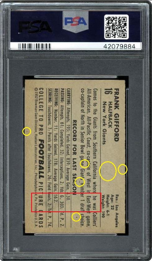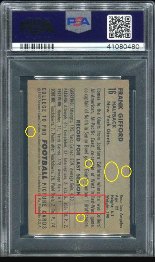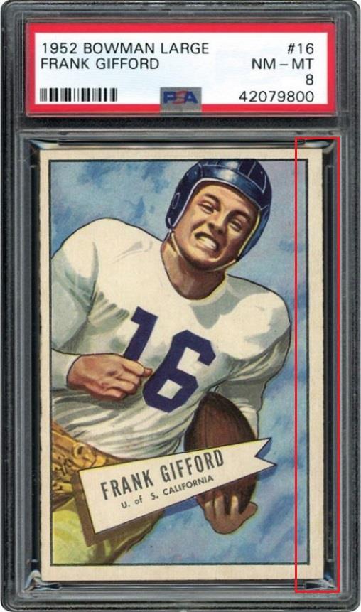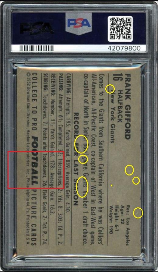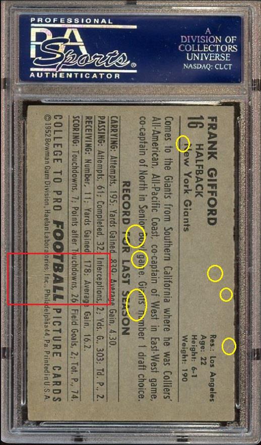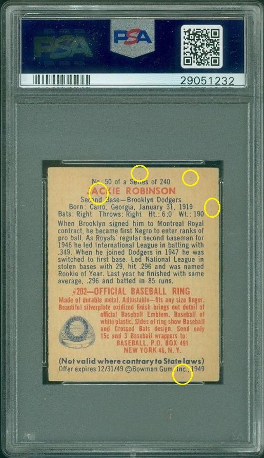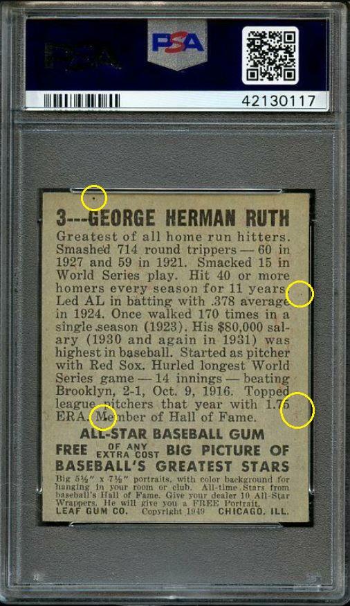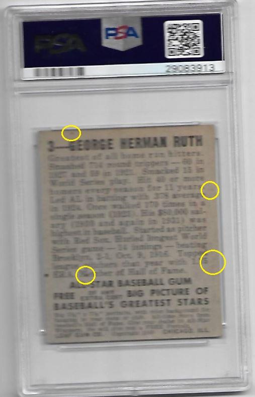 ![]() ![]() ![]() ![]() ![]() ![]() Longtime card dealer Craig Roehrig of Verona, Wisconsin has had an established relationship with PSA for many years and his company, Quality Cards, is a PSA dealer. Roehrig has had a reputation for dealing in high-end cards for several decades and is known for being the submitter to PSA for the grading of what became the 3rd PSA 10 1952 Topps Mickey Mantle card in 1999. Roehrig's Ebay store user ID is quality*cards. Roehrig buys with an unknown Ebay ID, which is masked in the Vintage Card Prices website (VCP) as c***1. Alteration methods found so far include trimming, crease removal, coloring, stain removal/minimization and corner repair most likely from pressing. In researching the various PSA numerically numbered submission runs, there is a mixture of cards being sold by quality*cards and Memory Lane Auctions, all purchased by the c***1 masked ID or an unknown ID if purchased from an auction house. He has also purchased raw cards which were discovered using the free CardTarget.Com website. I will post some of those later. All altered cards found to date have been graded by PSA experts. In two weeks of research I have uncovered a minimal amount of cards that can be confirmed as altered. There are many higher end cards in his PSA submissions but the lack of first purchase data is the result of many of those being purchased raw or through avenues where the online purchase data is not stored. ______________________________________________________________________________________________________________________ Quality Cards is PSA Dealer (snipped from the PSA website) Link: ![]() ______________________________________________________________________________________________________________________ July 11, 2001 article regarding Roehrig's submission of what became a graded PSA 10 1952 Topps Mickey Mantle (snipped from the PSA website) Link: https://www.psacard.com/articles/art...brings-275-000 ![]() ______________________________________________________________________________________________________________________ Altered cards: ______________________________________________________________________________________________________________________ PSA Cert #40804620 1949 Bowman Jackie Robinson #50 PSA Set Registry: none Value gain of $1,635.99 This card was purchased by masked VCP ID c***1 (Craig Roehrig) from Ebay seller teri781 as a PSA 5.5 for $1,964.00 on April 25, 2018. VCP link: https://vintagecardprices.com/card/b.../52402/PSA/5.5 Same card was sold by quality*cards (Craig Roehrig) as a PSA 7 for $3,599.99 on November 05, 2018. VCP link: https://vintagecardprices.com/card/b...50/52402/PSA/7 Yellow circles are print, fiber, or chipping identifiers. Red box identifies trimmed bottom edge The top has likely been micro-trimmed as well. Top right corner has been sharpened. ![]() ![]() ![]() ![]() ![]() ![]() ![]() ![]() ______________________________________________________________________________________________________________________ PSA Cert #42079894 1951 Bowman Dante Lavelli #73 - Population 1 of 3 PSA Set Registry: Mark W Value gain of $2,953.99 This card was purchased by masked VCP ID c***1 (Craig Roehrig) from Ebay seller kityoungcards as a PSA 6 for $42.00 on September 02, 2018. VCP link: https://vintagecardprices.com/card/f...3/101046/PSA/6 Same card was sold by quality*cards (Craig Roehrig) as a PSA 9 for $2,995.99 on November 29, 2018. VCP link: https://vintagecardprices.com/card/f...3/101046/PSA/9 Yellow circles are print, fiber, or chipping identifiers. Red box identifies where color has been added to minimize/mask obvious printing flaw. No back image provided with the first sale. ![]() ![]() ![]() ______________________________________________________________________________________________________________________ PSA Cert #42130117 1948 Leaf Babe Ruth #3 PSA Set Registry: none Value gain of $1,195.99 This card was purchased by masked VCP ID c***1 (Craig Roehrig) from Ebay seller scu316 as a PSA 2.5 for $1,000.00 on April 21, 2018. VCP link: https://vintagecardprices.com/card/b.../42417/PSA/2.5 Same card was sold by Ebay seller quality*cards (Craig Roehrig) as a PSA 3 for $2,195.99 on April 10, 2019. VCP link: https://vintagecardprices.com/card/b...-3/42417/PSA/3 Yellow circles are print, fiber, or chipping identifiers. Red boxes identify corner work. I don't know enough to say what was done, but something was done. ![]() ![]() ![]() ![]() ![]() ![]() ![]() ![]() ______________________________________________________________________________________________________________________ PSA Cert #42079884 1952 Bowman Small Frank Gifford #16 - Population 1 of 4 PSA Set Registry: The Hawkeye Collection Value gain of $4,384.01 This card was purchased by masked VCP ID c***1 (Craig Roehrig) from Ebay seller amerlegends as a PSA 6 for $319.99 on August 23, 2018. VCP link: https://vintagecardprices.com/card/f...6/100760/PSA/6 Same card was sold by Memory Lane Auctions as a PSA 9 for $4,704.00 on April 06, 2019. VCP link: https://vintagecardprices.com/card/f...6/100760/PSA/9 Yellow circles are print, fiber, or chipping identifiers. Red box identifies trimmed bottom edge and stain removed from back. ![]() ![]() ![]() ![]() ______________________________________________________________________________________________________________________ PSA Cert #42079800 1952 Bowman Large Frank Gifford #16 PSA Set Registry: none Value gain of $1,108.80 This card was purchased by masked VCP ID c***1 (Craig Roehrig) from Ebay seller b-e-collectibles as a PSA 5 for $180.00 on April 21, 2018. VCP link: https://vintagecardprices.com/card/f...6/154875/PSA/5 Same card was sold by Memory Lane Auctions as a PSA 8 for $1,288.80 on April 06, 2019. VCP link: https://vintagecardprices.com/card/f...6/154875/PSA/8 Yellow circles are print, fiber, or chipping identifiers. Red box identifies trimmed right edge as well as what appears to be a spider crease on the back that looks to ha