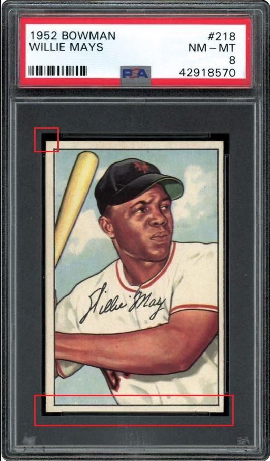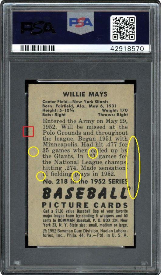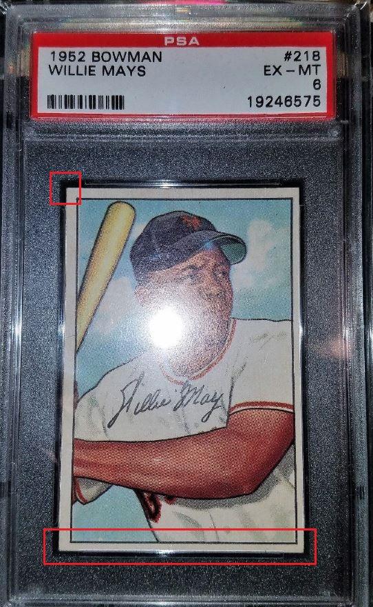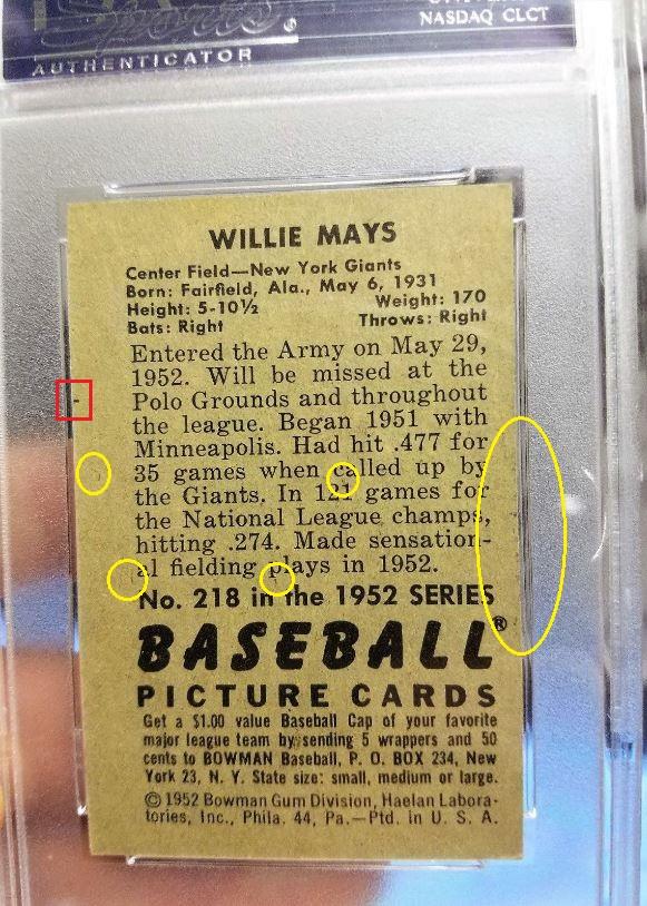 1952 Bowman Willie Mays #218 PSA Set Registry: JT's 52 Bowman BB Value gain of $6,483.60 This card was purchased by masked VCP ID c***1 (Craig Roehrig) from Ebay seller ja44 as a PSA 6 for $1,050.00 onDecember 07, 2018. VCP link: https://vintagecardprices.com/card/b...18/69235/PSA/6 Same card was sold by Memory Lane Auctions as a PSA 8 for $7,533.60 on April 06, 2019. VCP link: https://vintagecardprices.com/card/b...18/69235/PSA/8 Yellow circles are print, fiber, or chipping identifiers. Red boxes identify sharpened corners (3 shown). What was done to improve them is debatable with internet images but they have been altered. Dark spot mostly removed from the left back. ![]() ![]() ![]() ![]() ![]() ![]()