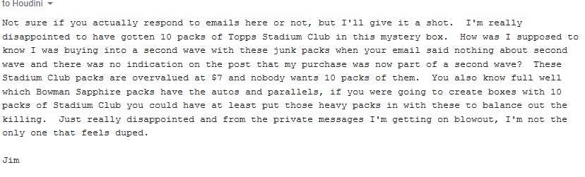 I had a Sapphire pack, all base, my wave 1 and wave 2 mystery boxes were nothing to write home about. I equate it to my golf game........packs or group breaks I’ve been in a funk lately, but it’s the nature of the beast streaky and has its ups and downs. I’ll keep buying and swinging one of these days I’ll hit a hole in one. Houdini your one of the best in the biz, don’t let hobby deadbeats drag you down.