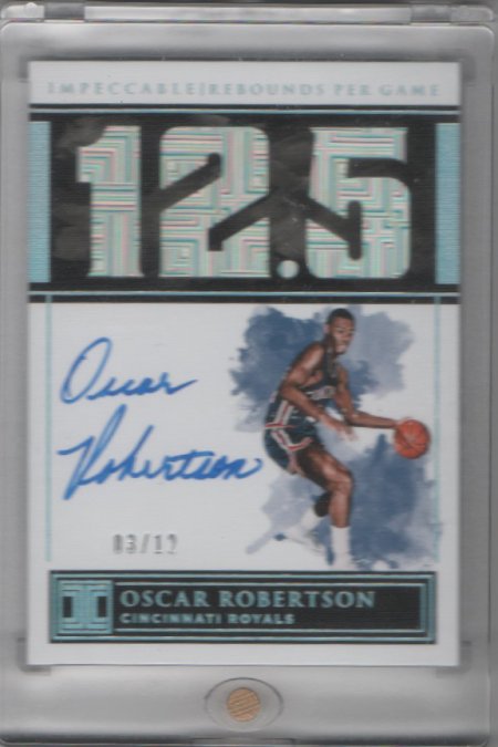 ![]() 2012 Immaculate all star lineage #ed to the amount of times a player made the all star game. Magic played in 12 so this is /12. I wish each photo was from a different all star game instead of using one photo 12 times. ![]() 2018 Impeccable rebounds per game. In Oscar's second season in the NBA, he avaerage4d 12.5 rebounds a game so this card is /12. Some of the impecable cards are very low numbered, show some off!