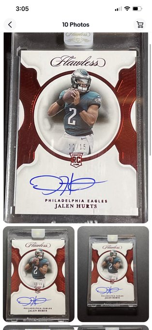 For example: 2020 Jalen Hurts FRS-JHU Panini Flawless Ruby Auto 12/15 ![]() ![]() Sent from my iPhone using Tapatalk |