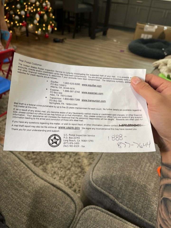 Get an email report going via the website. They'll act like you're inconveniencing them until there's a paper trail and responsibility put on them. I got my entire neighborhood's post office branch changed, a few years back, due to the behaviors of the carrier(s) lying about packages being delivered, just leaving notes, etc. I mean, he admitted that they have theft occurring due to "stimulus checks". Really? That's interesting. According to that piece of paper, it's a federal offense. If the boxes are monitored, should be reaaaallly easy to figure out, you'd think. Sorry it happened, but I have NO patience in dealing with a thief.