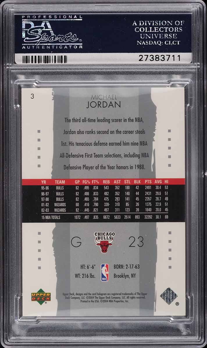 Lastly, since you want the years Jordan played, and with 02/03 being his final year, I think you HAVE to include a card from 03/04 (will have to be UD) as that will have his 02/03 stats on it! Also, ending with 03/04 is perfect since 86 Fleer, 96 Chrome, and 03/04 Exquisite are the most iconic sets for those decades! I'm obviously biased, but with only 225 total copies, I say eventually try and get ANY Jordan base 03/04 Exquisite and you'll love it! Maybe grab his 03/04 UD now for a few bucks... or Victory, SPx, maybe a few bucks more, etc... or whatever design you like best - I actually like his 03/04 Hardcourt base a lot! Again, I'll stress that I think you need to add an 03/04 Card to "complete" the playing days! Let's say you settle on his 02/03 Chrome as your final card - that only has his stats from 01/02... doesn't feel complete to me... maybe that's just me but I'll just show the back of the Exquiste base to show what that last stat year looks like - and because it's his best "Base card" not an RC in my opinion! Whatever you choose to do - have fun doing it and post your progress! Last edited by Exquisite074; 12-08-2022 at 01:45 AM. |