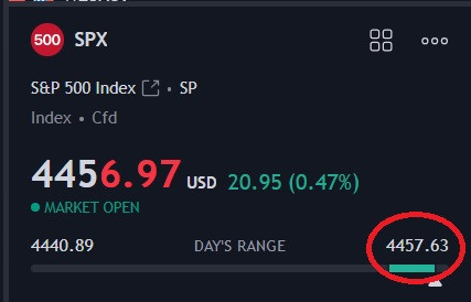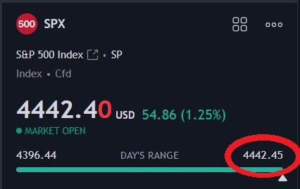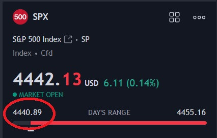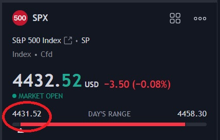 ------------------------------------------------------------------------------------ Added 9:18 Got it. Left some runners will stop in profits if it reverses. ![]() ![]() ------------------------------------------------------------------------------------------------------------------------ Added 9:26 All out here @ 4431 - close enough to my SPX 4430 support level. See what we do here.