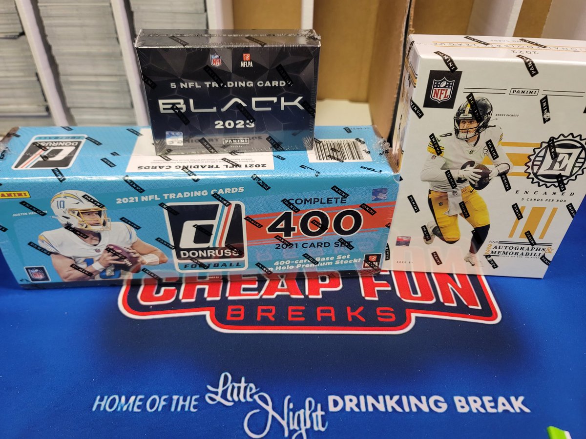 1. Every spot you buy gets you a team in all 3 breaks. 2. Just 1 of these for now, but I may add extra breaks. 3. I cannot put all your spots in just 1 break or anything like that - every spot gets you in all 3 breaks. Break 1 2021 Donruss Football Holo Premium Set 2022 Panini Encased Hobby Box 2023 Panini Black Hobby Box Break 2 2021 Donruss Football Set (Fanatics Exclusive/white w/pack) 2018 Optic Contenders Hobby Box 2021 Panini Prestige Blaster Break 3 2020 Panini Phoenix Set (Fanatics Exclusive) 2020 Panini Absolute Hobby Mini Box 2017 Donruss Optic Value Pack You get a team in all 3 breaks with every spot you purchase! Each break has it's own random. 3 Breaks, 32 spots each This break is scheduled for Sunday Afternoon! Payment instructions: 1. Add your username in the box provided before clicking button. 2. Log in to paypal to use your account normally OR stay logged out to use button as guest & use a credit card. 3. MAKE SURE YOUR ADDRESS IS CORRECT. I absolutely MUST ship to the address attached to your payment from paypal. 4. No refunds or returns, sorry. 5. No echecks. In the event of an echeck, it will have to clear in 3-5 days and then be refunded. 49ers Bears Bengals Bills Broncos Browns Buccaneers Cardinals Chargers Chiefs Colts Commanders Cowboys Dolphins Eagles Falcons Giants Jaguars Jets Lions Packers Panthers Patriots Raiders Rams Ravens Saints Seahawks Steelers Texans Titans Vikings