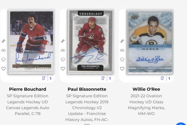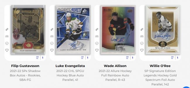 These are all on EPack. Claim/offer in thread Here is my T4T thread for 2023 https://www.blowoutforums.com/showth...1#post19108061 Prices listed/OBO and % going to T4T. Pic 1 Gustuvsson /175 $35 40% to T4T GONE Evangelista GONE Allison $5 100% to T4T O'Ree Gold $30 100% to T4T ![]() Pic 2 Bouchard Canvas auto $5 100% to T4TGONE Bissonnette Legends auto $7 100% to T4TGONE O'Ree SOLD ![]() Pic 3 hischier parkhurst auto $20 100% T4TGONE Makar Parkhurst Auto $179 40% to T4T PENDING