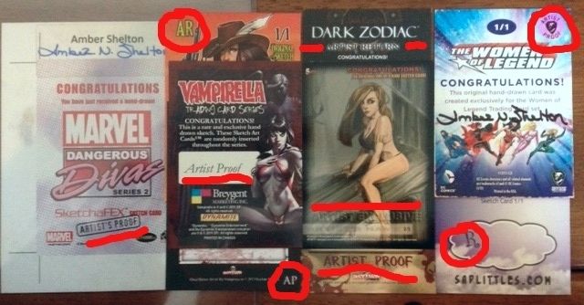 ------------------- 1/1 (One of One) 1/1 means it is one of one aka the only one like it in existence. Therefore, an original. Technically even repeated sketches (ie the much-derided Indiana Jones monkeys) are originals as the artist had to draw each by hand and from scratch. Even prints in the fine art world can be considered 1/1 if the artist added anything to the picture after the fact. Trading card fans, though, do not find repeated sketches as desirable or collectible and make an argument for its lack of individuality.ACEO (Artist Cards, Editions & Originals) Basically the Fine Art world's answer to trading cards' PSCs. Both are non-set, unofficial, unlicensed cards. ACEOs can be original art or prints (editions) and so might or might not be a copy. As suggested by their inclusion, prints are an accepted practice for fine art sketch cards... not so much, though, in the trading card world.Artist Exclusive (AE) Cards given to the sketch artists to sell for themselves as part of their compensation for completing set work. Artist Exclusives can be either Artist Proofs or Artist Returns. So when you're buying ARs or APs, while not pulled from packs, you're giving money directly to the artist rather than the company or flippers or what-have-you. Artist Proof (AP) Artist Proofs are blanks given to the sketch artists to sell for themselves as part of their compensation for completing set work. In other words, they are official, licensed and affiliated with particular sets, but not inserted into packs or able to be pulled by collectors; only obtained from participating artists. Artists may either sell APs as commissions on the cards or complete the cards to sell finished, at their discretion, both pending licenser approval. Essentially, APs and ARs are both compensation and tend to be used interchangeably more and more often. When you buy APs you are giving money directly to the artist.Artist Return (AR) Artist Returns are cards completed alongside the set cards, but returned to the sketch artists to sell for themselves as part of their compensation for completing set work. In other words, they are official, licensed and affiliated with particular sets, but not inserted into packs or able to be pulled by collectors; only obtained from participating artists. They are always sold finished. Some Returns must be given back to the company with the set cards (hence Return) in order to be marked as such, and then are shipped back to the artist again. Some come to the artist already labeled as Returns and only require scans to be sent for licenser approval. Essentially, APs and ARs are both compensation and tend to be used interchangeably more and more often. When you buy APs you are giving money directly to the artist.ATC (Artist Trading Card) ATC is a term that came from the fine art faction of sketch cards rather than the trading card faction. ATCs were meant to be a way for artists to be able to collect art, themselves. By definition, ATCs were never to be offered for sale or paid for, only traded.Chase Cards Rare inserts of various types included in card products. Inserted in a ratio so as not to be found and completed at the same rate as common cards, collectors have to "chase" them in order to complete whole sets. Nonsports Chase Cards can be anything from varients of base cards, specially finished cards, wardrobe and autograph cards, sketch cards... or a whole slew of other possibilities.Base Cards Base cards are reproductions of art, photos or screencaps that may or may not originally be 2.5x3.5" These are not the same as sketch cards, which are original art done directly on blank card canvases.Pack Pulled (or Packed Out) Sketch Cards These are original art cards commissioned by card companies to be inserted into their products. Some card sets are considered Premium Sketch Products and contain one or more sketch card as the main feature of a pack. Some card sets are more traditional and use Sketch Cards as one of many types of incentive or chase cards, with the main feature being Base Cards and Sketches falling less than one per pack... like once per box or per case. Regardless of rarity, pack pulled sketch cards always* have a chance to be, yanno, "pack pulled" by collectors.PSC (Personal Sketch Card) Cards completed by artists as personal projects and not in association with an official or licensed sketch/card product. Artists often draw licensed properties (ie Marvel characters) on PSCs, but since they are not affiliated with official sets (ie Rittenhouse or Upper Deck products) they were not approved by by the license holder.Return *see Artist Return*Sketch Cards Original art drawn on 2.5x3.5" canvases, typically, but can sometimes be larger as in oversized, double, triple or quad paneled or booklet cards. Sketch cards can be pretty much anything within those bounds. Artists create sketch cards with marker, pencil, colored pencil, ink, paint... you name it. Sketch cards can be cut from larger canvases by the artist, bought pre-cut, on personal stock commissioned by the artist from printers, or official set card stock.