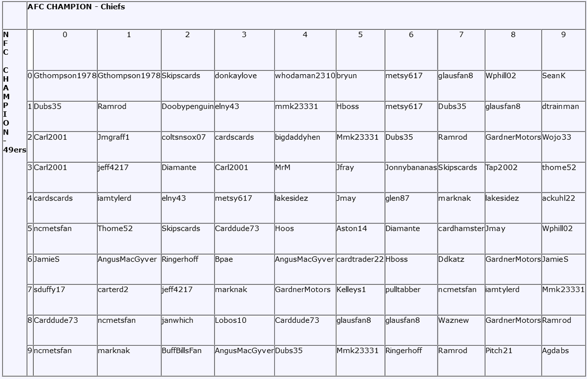 2. Only 1 square per person, per day. Houdini's Big Game Box For $5.00 you get: 1 sports card pack: Your purchase will also get you a free spot on the square board (see rules below for details). Everyone gets the same pack. All 100 People. Watch the big game on Sunday, February 11, 2024. At the end of the 1st 3 quarters & final score, match the last digit of each teams score with the grid. Example: At the end of the first quarter, the AFC Team has 17 points and the NFC Team has 14 points. Go to the AFC Team top row of numbers and find the number 7 (last digit of 17) then go to the NFC Team left column of numbers and find the number 4 (last digit of 14) find where these two numbers intersect on the grid and the name in that square wins the first quarter prize! Prizes are for the big game 2/11/24: 1st QUARTER 2021 Panini Prizm Football Multi-Pack (~$15-$20 value) HALFTIME 2021 Panini Prizm Football Hanger Pack Box (~$32 value) 3rd QUARTER 2021 Panini Prizm Football Multi-Pack (~$15-$20 value) FINAL SCORE (in event of overtime, the final score is used here) 2020 Panini Phoenix Football Fanatics Box Set (~$125 value) 100 spots