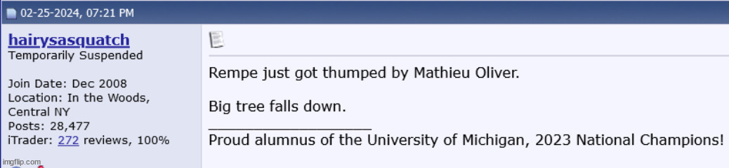 his ironic final post about someone getting thumped.....