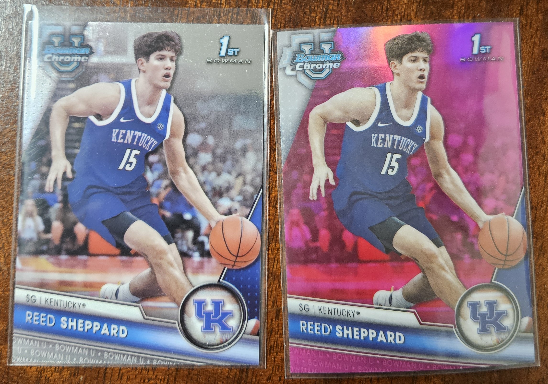 Have you seen anything like this? I opened 10 Blaster boxes of 2023-24 Bowman Chrome U basketball. Bought them direct from Topps. On the Reed Sheppard pink refractor, there is a little lightning bolt after his first name. The picture is a little blurry, but no mistaking, it's a lightning bolt. Tons of this card on ebay, none of the others have it. Nothing on Google either. I haven'[t seen any other players with it either. [ATTACH][ATTACH]Attachment 550660[/ATTACH][/ATTACH]