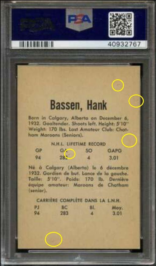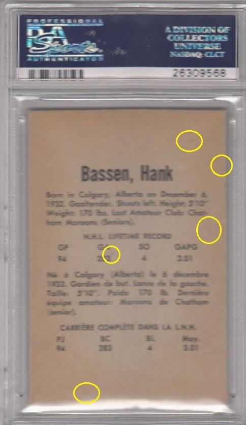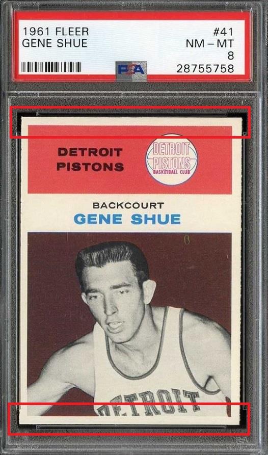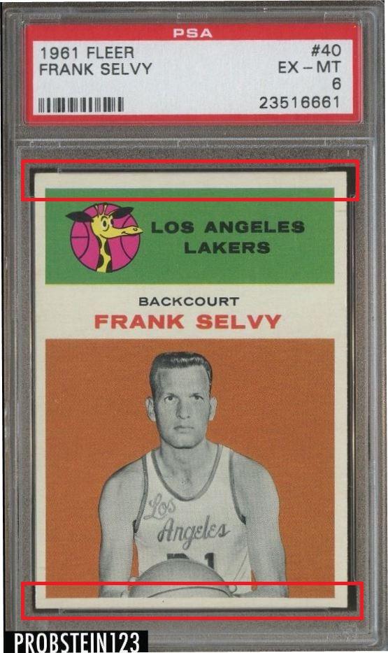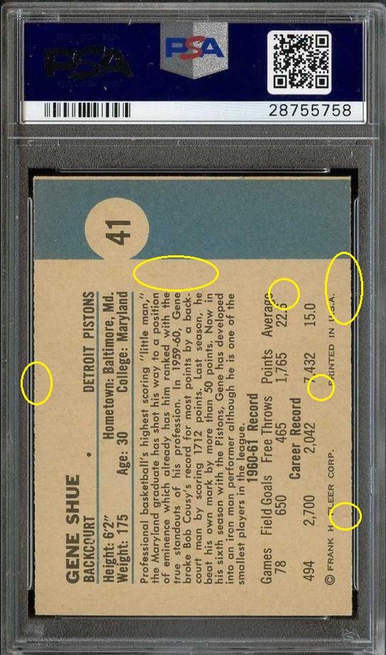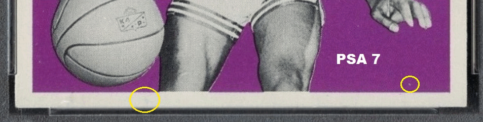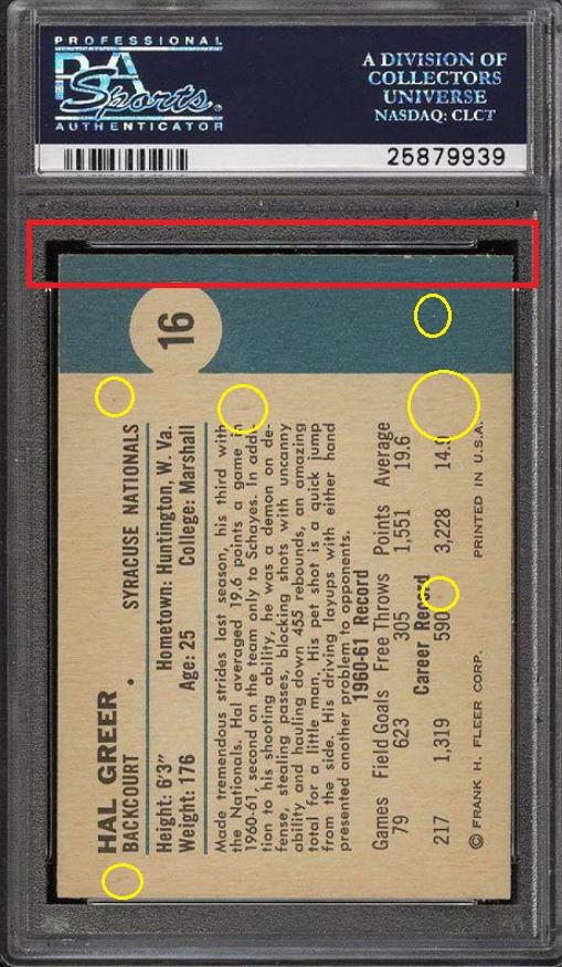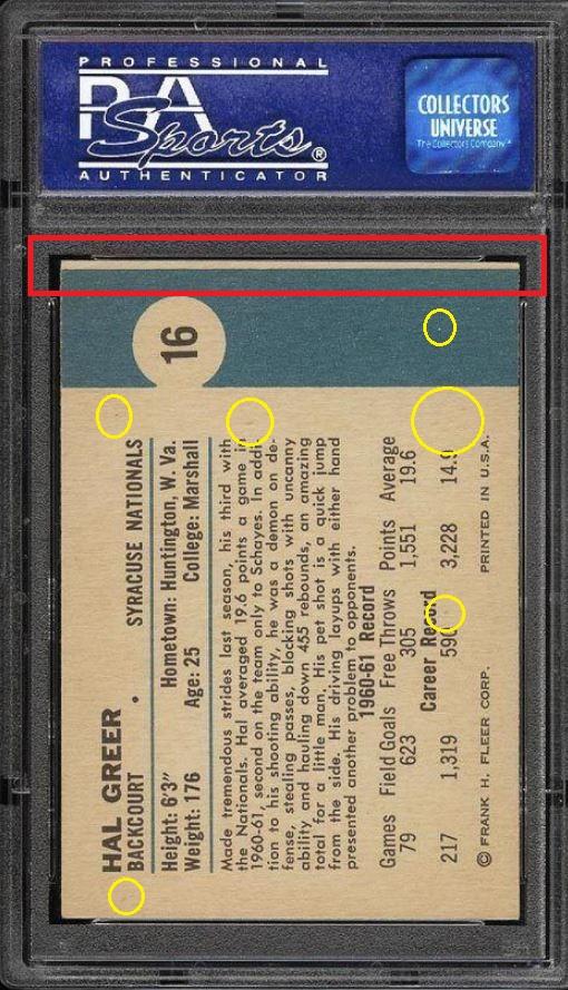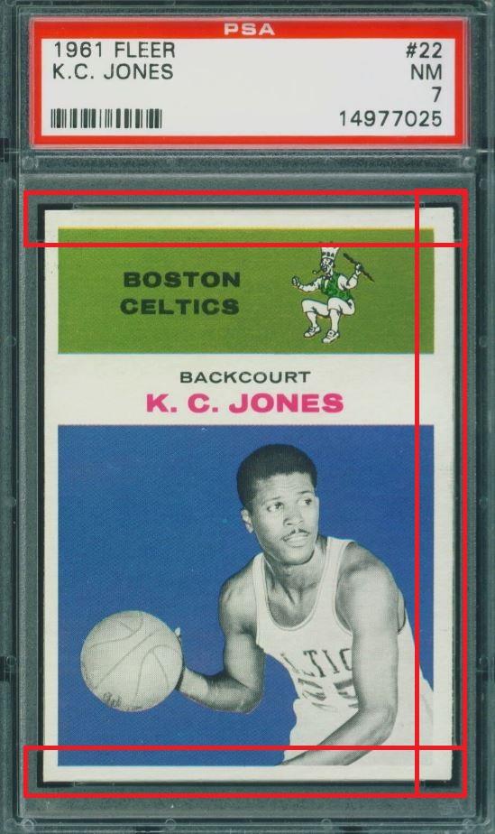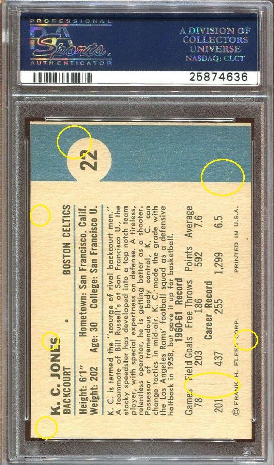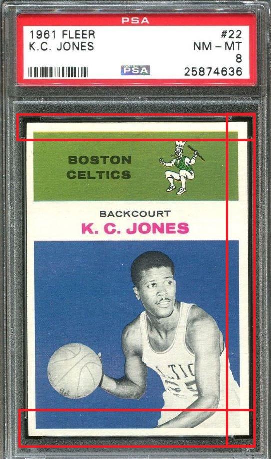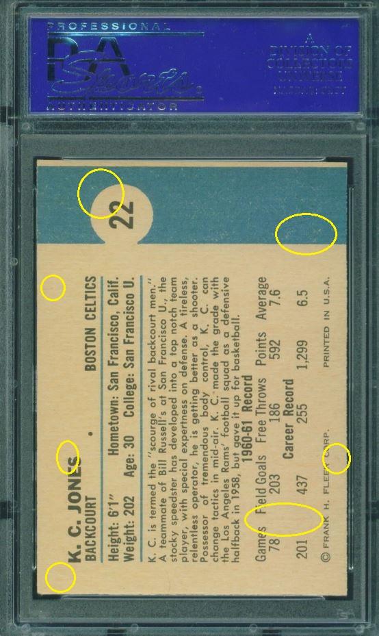 PSA Cert #25874636 1961 Fleer K.C. Jones #22 Value gain of $122.05 PSA Set Registry: None found This card was purchased by VCP masked buyer ID b***b (Andy Tuttle) from Ebay seller stevenovella as a PSA 7 for $86.00 on April 07, 2016. Same card was sold by Ebay seller consignmints (Andy Tuttle) as a PSA 8 for $208.05 on August 21, 2016. Yellow circles are print, fiber, or chipping identifiers. Red boxes identify trimmed top, right and bottom edges. ![]() ![]() ![]() ![]() ![]() ![]() ![]()