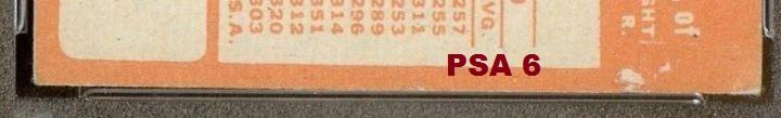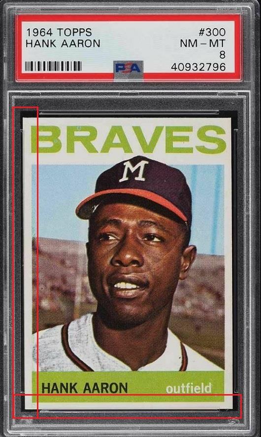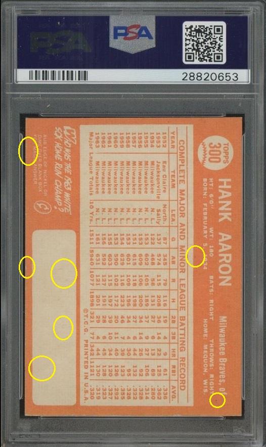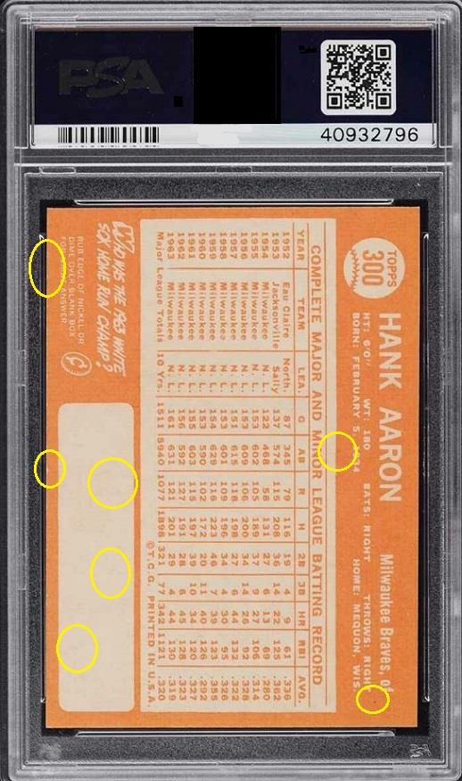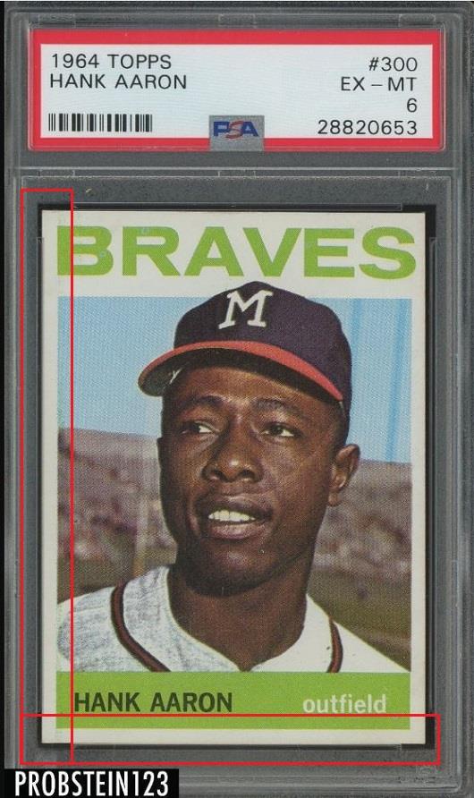 PSA Cert #40932796 1964 Topps Hank Aaron #300 Value gain of $395.50 PSA Set Registry: None found This card was purchased by VCP masked buyer ID b***b (Andy Tuttle) from Ebay seller probstein123 as a PSA 6 for $129.50 on April 24, 2018. Same card was sold by Ebay seller consignmints (Andy Tuttle) as a PSA 8 for $525.00 on March 07, 2019. Yellow circles are print, fiber, or chipping identifiers. Red boxes identify trimmed left and bottom edges. ![]() ![]() ![]() ![]() ![]()