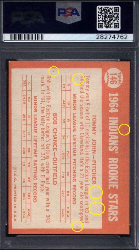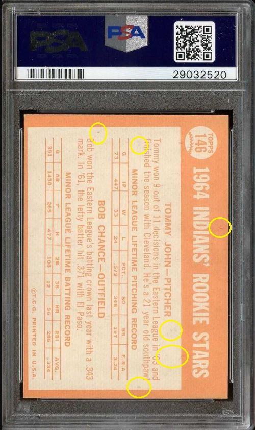 PSA Cert #29032520 1964 Topps Indians Rookies #146 Value gain of $30.00 PSA Set Registry: None found This card was purchased by VCP masked buyer ID b***b (Andy Tuttle) from Ebay seller just_collect as a PSA 7.5 for $45.00 on December 31, 2017. Same card was sold by Ebay seller consignmints (Andy Tuttle) as a PSA 8 for $75.00 on May 26, 2018. Yellow circles are print, fiber, or chipping identifiers. Red boxes identify trimmed left and right edges. ![]() ![]() ![]() ![]() ![]()