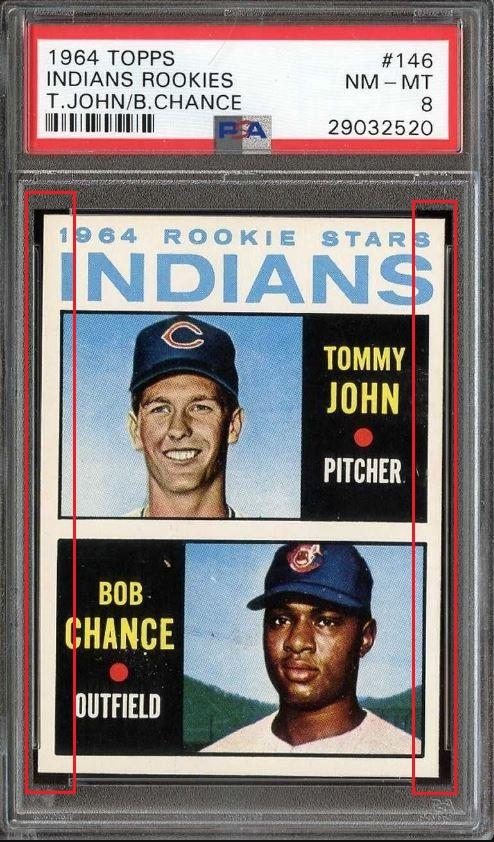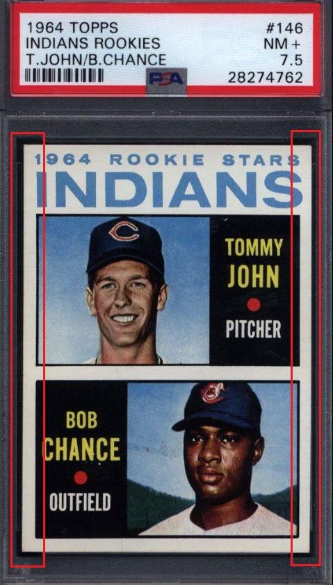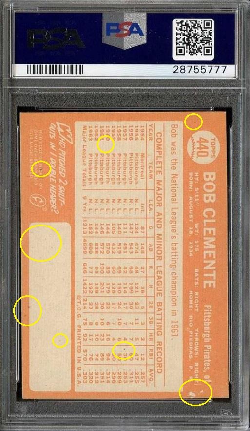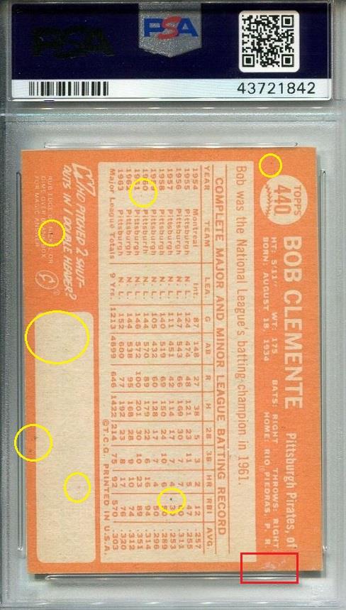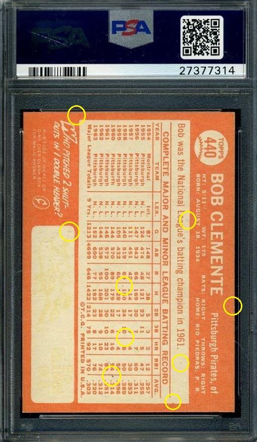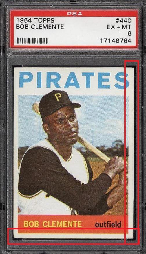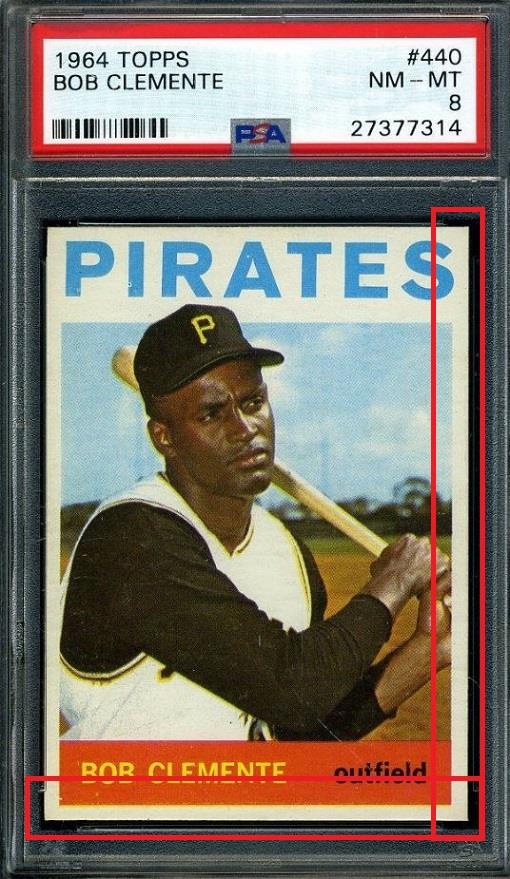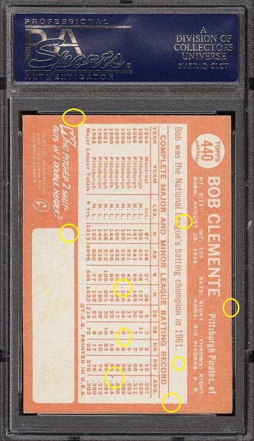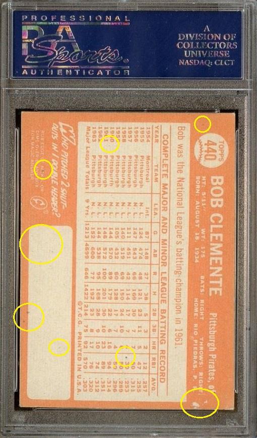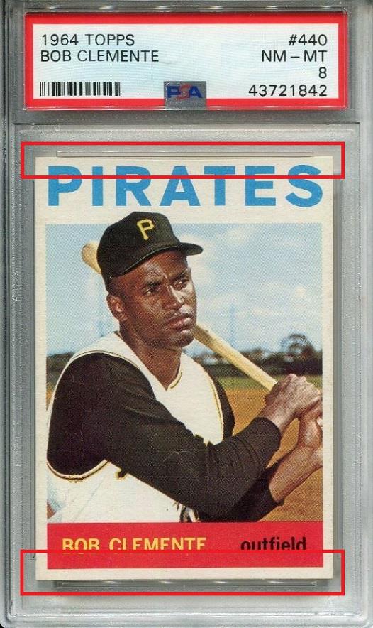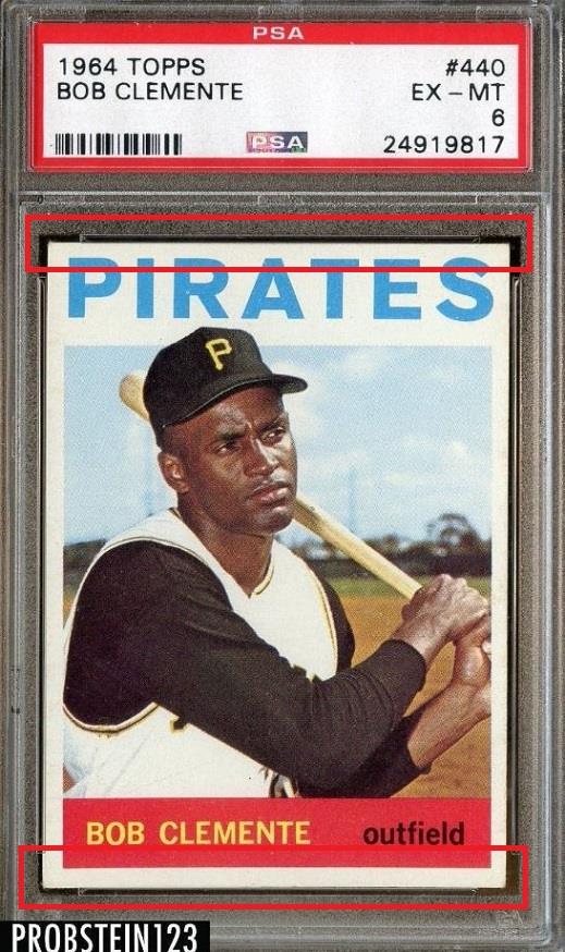 this documentation in both of their threads. Both Andy Tuttle (consignmints) and John Slight (sundiegocollectibles) are prolific card trimmers and still actively sell through their Ebay stores. PSA 6 to PSA 5 to PSA 8 PSA Cert #24919817 (initial purchase by Tuttle) PSA Cert #28755777 (trimmed by Tuttle, graded by PSA and sold to John Slight) PSA Cert #43721842 (color added to back, graded by PSA and sold by John Slight) 1964 Topps Bob Clemente #440 First value gain of $5.50 Second value gain of $558.00 PSA Set Registry: None found This card was initially purchased by VCP masked buyer ID b***b (Andy Tuttle) from Ebay seller probstein123 as a PSA 6 for $144.50 on January 22, 2018. Same card was altered and sold by Ebay seller consignmints (Andy Tuttle) as a PSA 5 for $150.00 on February 26, 2018. That card was purchased by VCP masked buyer ID t***c (John and Kamala Slight) Same card was altered and sold by John and Kamala Slight (sundiegocollectibles) as a PSA 8 for $708.00 on October 10, 2019. Yellow circles are print, fiber, or chipping identifiers. Red boxes identify trimmed right and bottom edges. ![]() ![]() ![]() ![]() ![]() ![]() ![]() ![]() ![]() ![]() ![]() ![]()