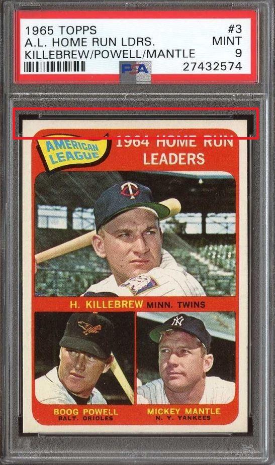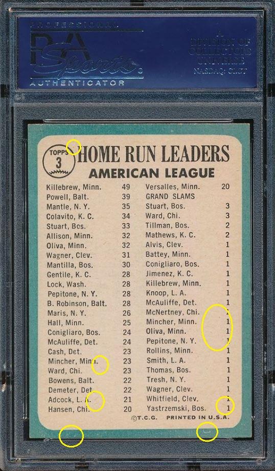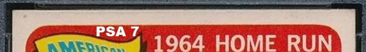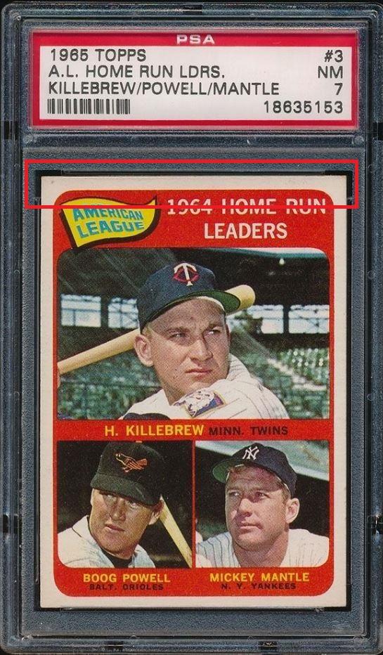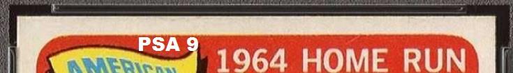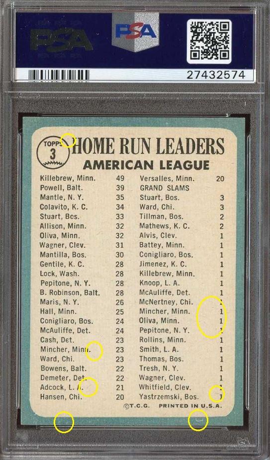 PSA Cert #27432574 1965 Topps A.L. Home Run Leaders #3 Value gain of $414.50 PSA Set Registry: None found This card was purchased by VCP masked buyer ID b***b (Andy Tuttle) from Ebay seller gregmorriscards as a PSA 7 for $50.50 on April 02, 2017. Same card was sold by Ebay seller consignmints (Andy Tuttle) as a PSA 9 for $465.00 on October 13, 2017. Yellow circles are print, fiber, or chipping identifiers. Red box identifies trimmed top edge. The bottom is also trimmed. ![]() ![]() ![]() ![]() ![]() ![]()