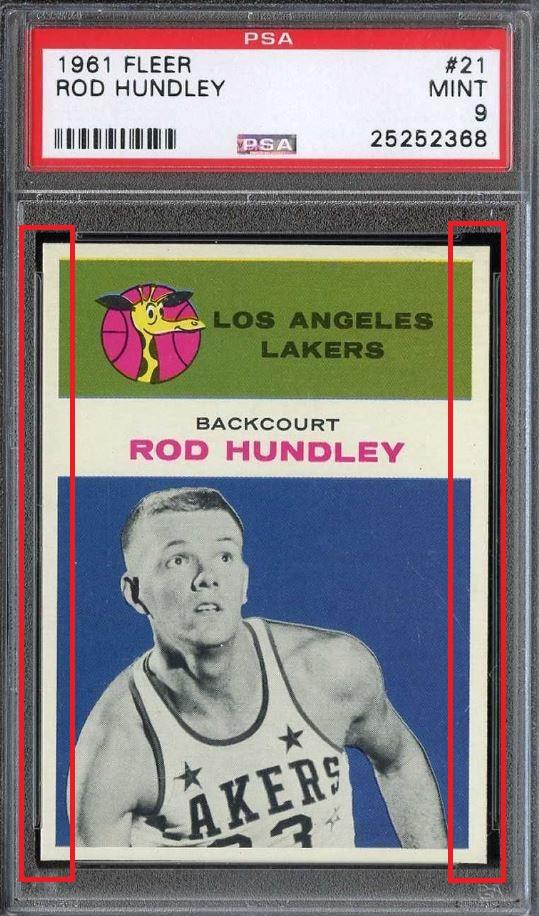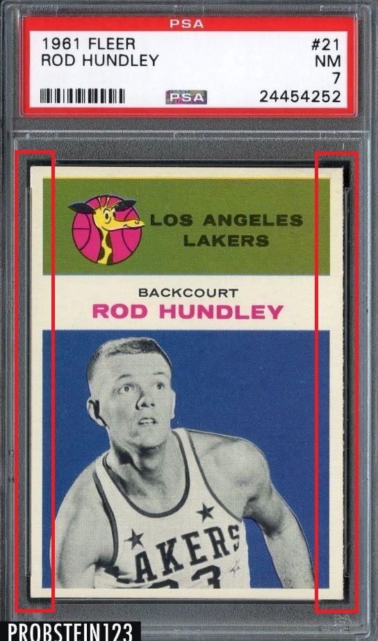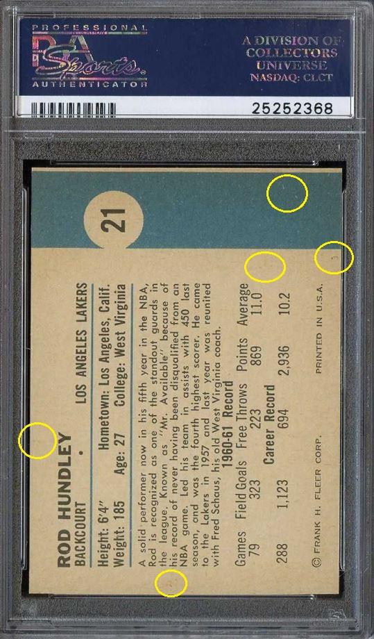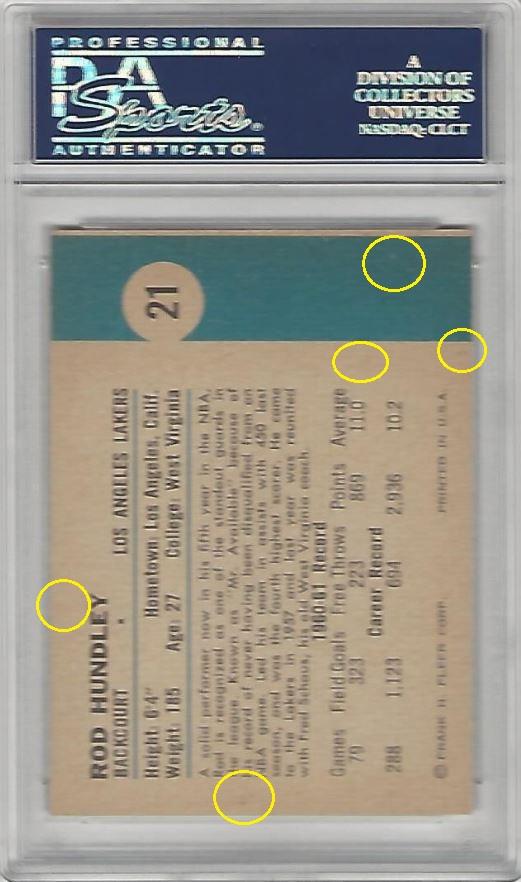 PSA Cert #25252368 1961 Fleer Rod Hundley #21 Value gain of $452.39 PSA Set Registry: jtsports1961 This card was purchased by VCP masked buyer ID b***b (Andy Tuttle) from Ebay seller probstein123 as a PSA 7 for $57.61 on December 01, 2015. Same card was sold by Ebay seller consignmints (Andy Tuttle) as a PSA 9 for $510.00 on May 17, 2016. Yellow circles are print, fiber, or chipping identifiers. Red boxes identify trimmed left and right edges. There was no back image from initial purchase so I found the blurry one from a prior sale. ![]() ![]() ![]() ![]() ![]() ![]() ![]()