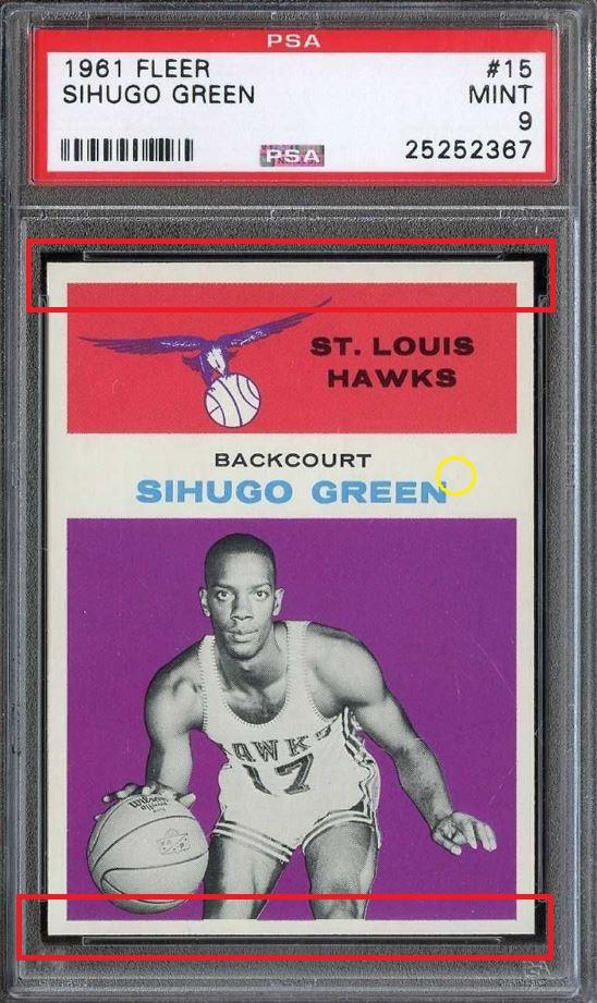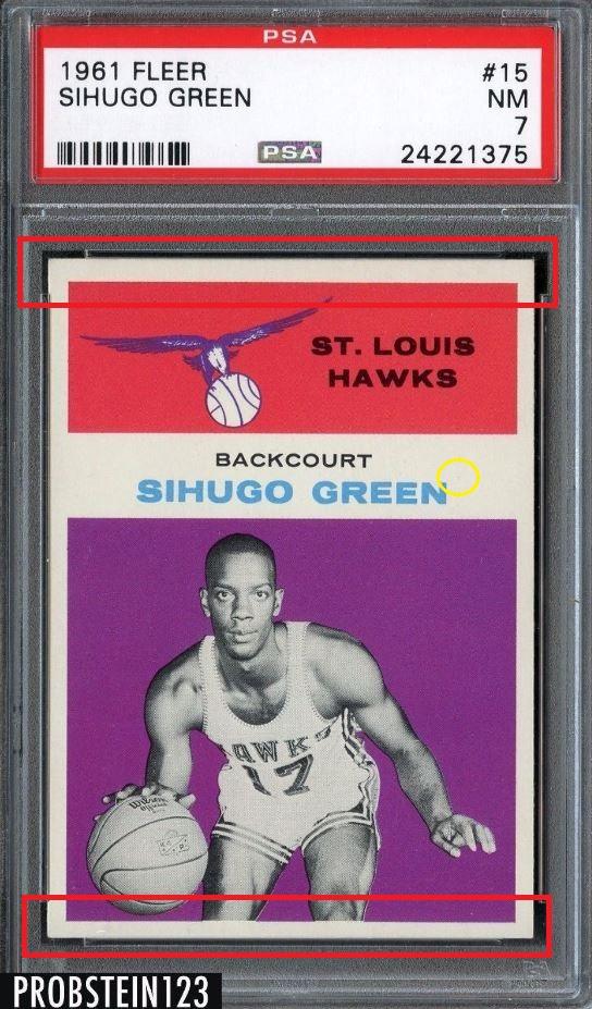 PSA Cert #25252367 1961 Fleer Sihugo Green #15 Value gain of $416.67 PSA Set Registry: jtsports1961 This card was purchased by VCP masked buyer ID b***b (Andy Tuttle) from Ebay seller probstein123 as a PSA 7 for $34.33 on December 01, 2015. Same card was sold by Ebay seller consignmints (Andy Tuttle) as a PSA 9 for $451.00 on May 17, 2016. Yellow circles are print, fiber, or chipping identifiers. Red boxes identify trimmed top and bottom edges. No back image provided with first sale. Edge chipping matches as well as several small imperfections on the front middle. ![]() ![]() ![]() ![]() ![]() ![]() ![]()