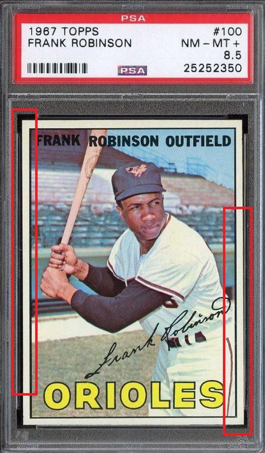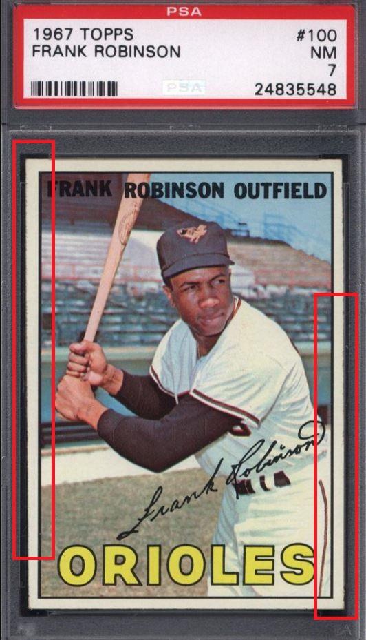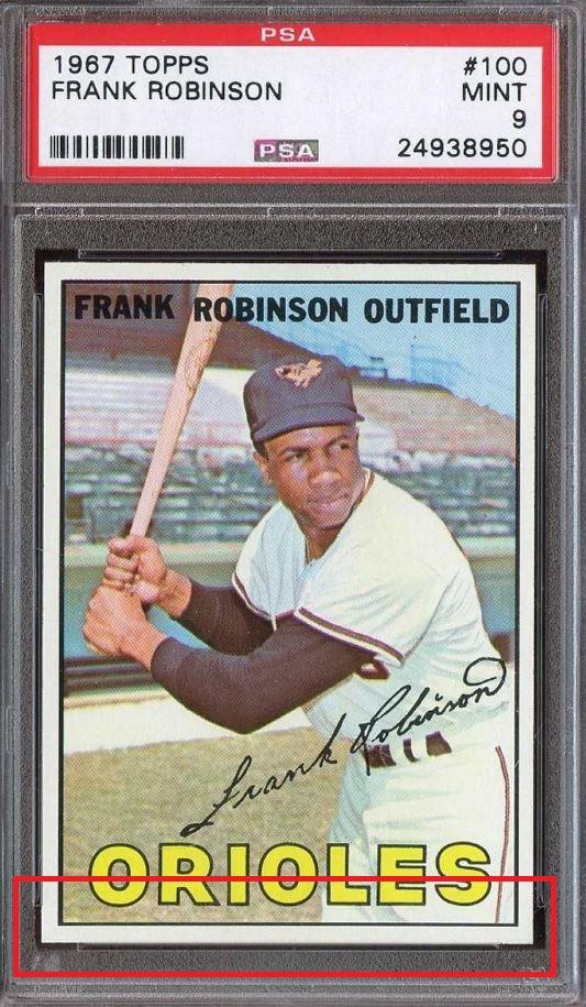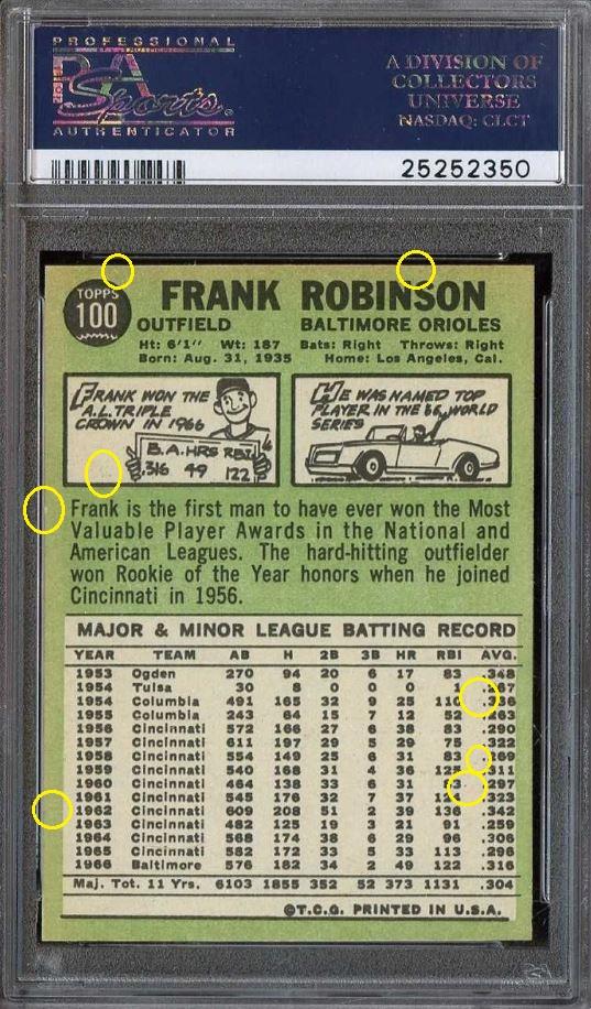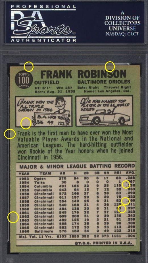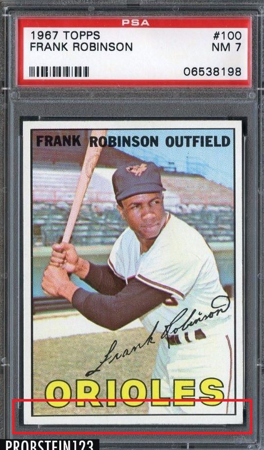 PSA Cert #24938950 1967 Topps Frank Robinson #100 Value gain of $185.33 PSA Set Registry: None found This card was purchased by VCP masked buyer ID b***b (Andy Tuttle) from Ebay seller probstein123 as a PSA 7 for $39.67 on October 21, 2015. Same card was sold by Ebay seller consignmints (Andy Tuttle) as a PSA 9 for $225.00 on June 02, 2016. Yellow circles are print, fiber, or chipping identifiers. Red box identifies trimmed bottom edge. No back image provided with initial purchase. Spots and chipping matches as shown. ![]() ![]() ![]() ![]() ![]() ![]() ![]()