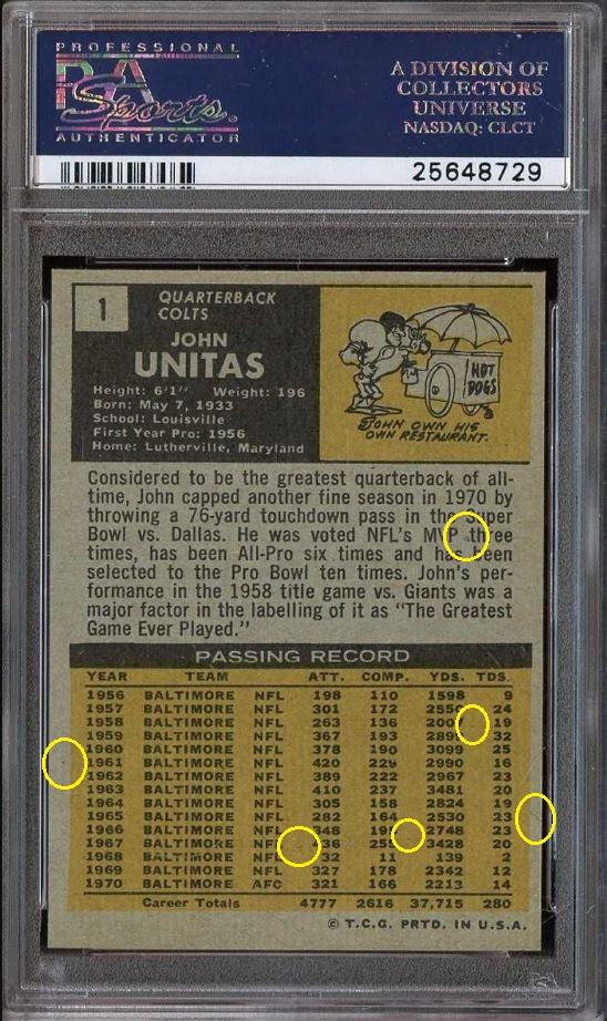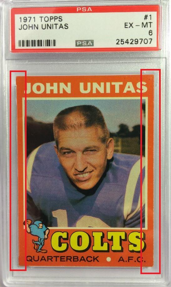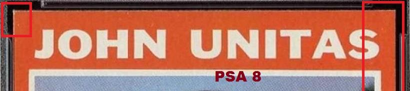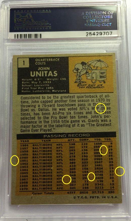 PSA Cert #25648729 1971 Topps John Unitas #1 Value gain of $109.35 PSA Set Registry: None found This card was purchased by VCP masked buyer ID b***b (Andy Tuttle) from Ebay seller kuna as a PSA 6 for $15.65 on March 30, 2016. Same card was sold by Ebay seller consignmints (Andy Tuttle) as a PSA 8 for $125.00 on May 23, 2016. Yellow circles are print, fiber, or chipping identifiers. Red boxes identify trimmed left and right edges. ![]() ![]() ![]() ![]() ![]()