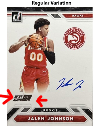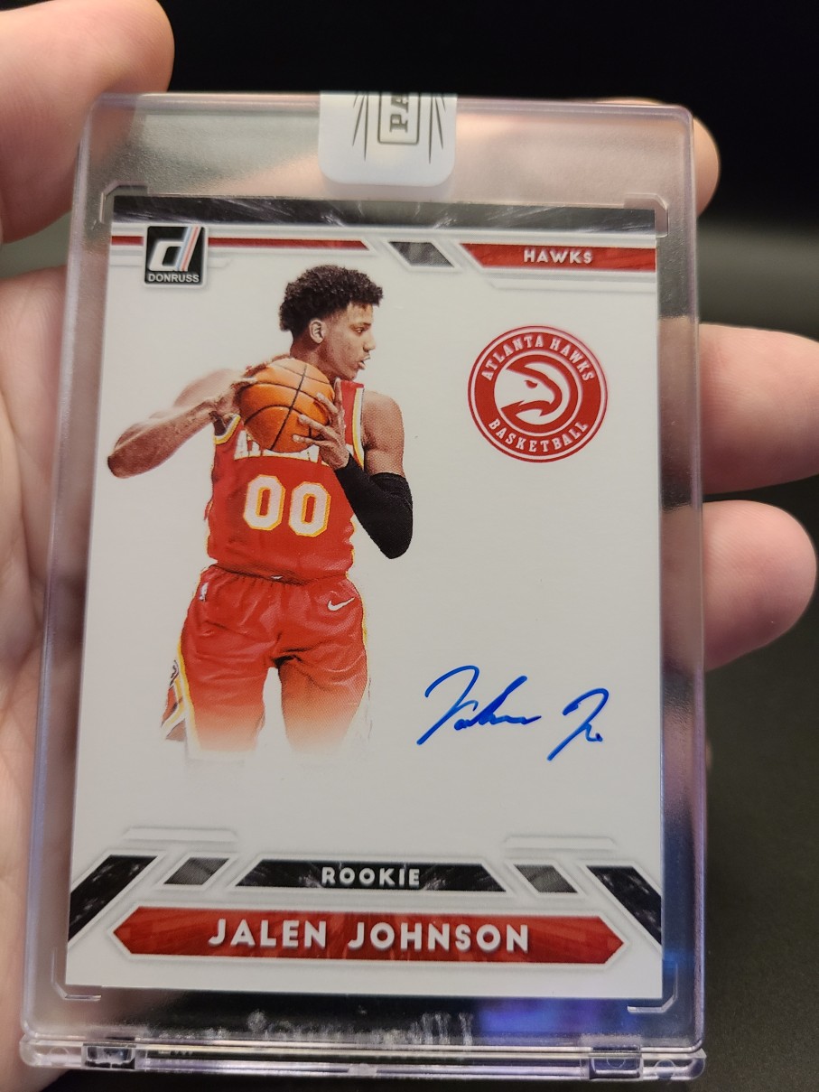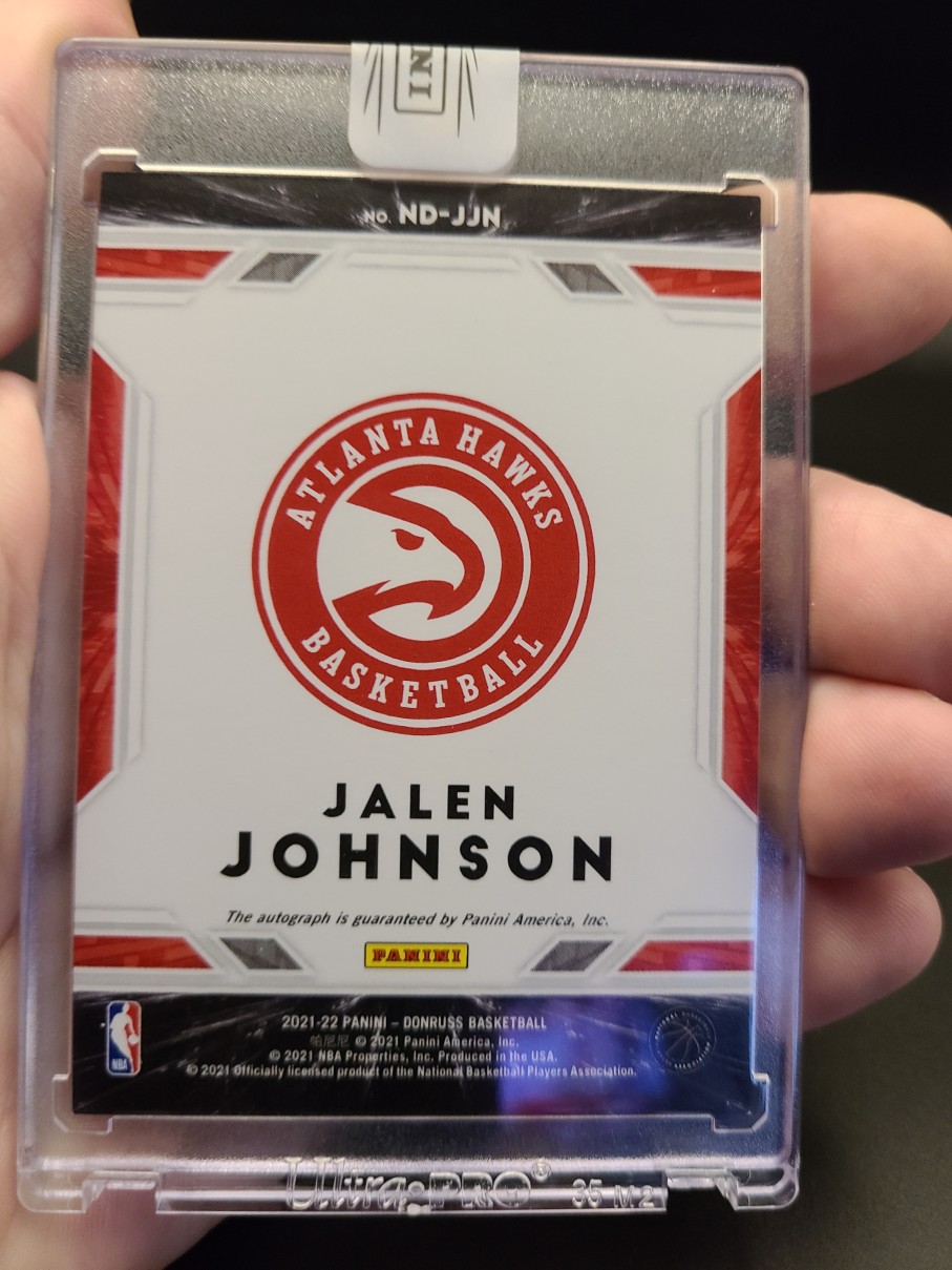 Anyway, over 3 years ago I bought a hobby box of Hoops and got a Franz Wagner Red Ink Auto /25 (But it had a chip on one of the edges, so I sent it back. 3+ Years later to my surprise, they replaced it with a 2021 Donruss Next Day on Card of Jalen Johnson sealed by Panini and encased. However, I noticed something I haven't seen before and was wondering if anyone out there has seen this is the 2021-22 Donruss Next Day Autos. The two pictures are of my version, and I showed a stock image. I would love to hear your opinions about this, and how do I go about authenticating it while still leaving the Factory Encased with Seal. I also have the Panini papers to back it up. Also has anyone seen this kind of error, it seems odd, especially since it s the name of the card set and that it came as a replacement for a damaged card. Q&C, Anyone or was it a gift of some sort, or maybe their farewell Thanks In advance ![]() Axel ![]() Regular Card ![]() Normal Back ![]() Edit because images were too big Last edited by Axel1942; 07-24-2025 at 06:17 PM. Reason: Pictures were to big |