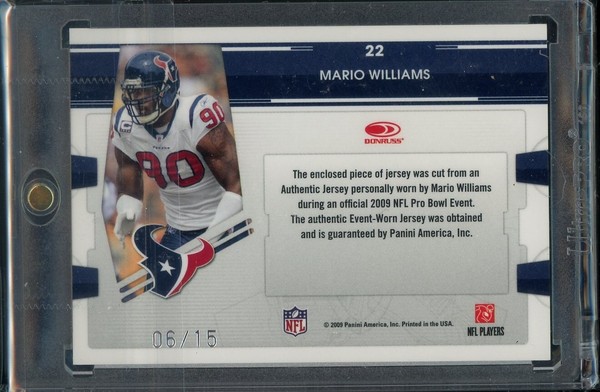A step above "Player Worn" IE, put on and taken off just to say they touched it stuff that came shortly after. In some sets back then, they were referred to as "Pro Bowl Events". Be it appearances, passing drills or some made for TV events like challenges. Like Mario Williams here. He went through all the events, but he did not play in the actual game due to a groin injury. Which is why DLP didnt show a picture of him during the game, like others in this set. ![]() But most likely cut up a jersey, like the one he wore here that year.