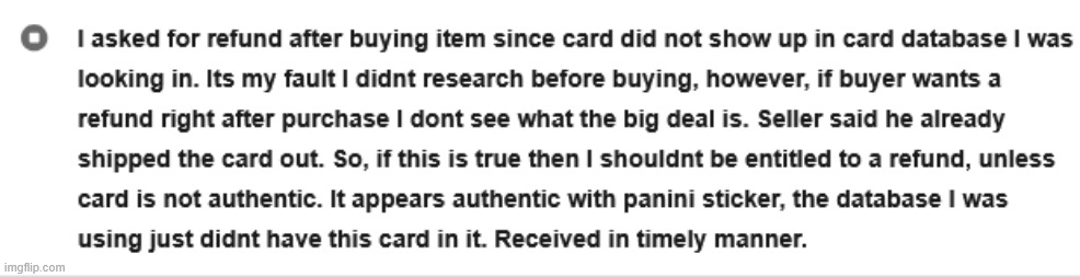 I’ve been selling on eBay for roughly 2 years now and never have I dealt with anybody this insane. It all started a few weeks ago when I got this return request (I’ll provide a photo). I’m sorry but I’m not accepting a request after 1. You’ve had it for a week 2. Refuse to elaborate on why it should be returned 3. Had time to take a photo for the return request, but not enough to look over the condition of the card that you “need more time for”? BS. So realizing it’s just a gem hunter I sent him a pm saying “I will accept your return, just please refrain from buying from me in the future.” Obviously that struck a nerve with him with this asinine fake negative feedback he left for me. He still has not mentioned if there was any damage on the card. I’ve called eBay multiple times trying to get it removed and they have been absolutely no help. It’s sad how they side blindly with the buyers these days . Easy block and honestly prayers out for this guys well-being because he needs some serious help.