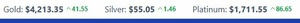 Silver is closing in on it's recent record high, currently at $53.71, gold a bit further from it's all time high, but still moving up and sitting at $4210.95 |