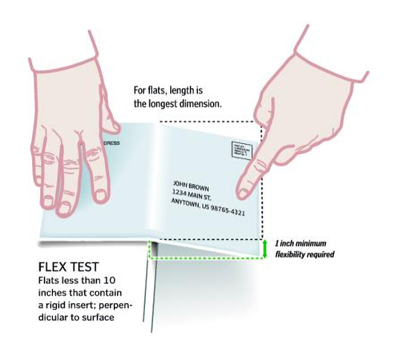 The key is to make sure it isn't rigid. This is the flex test used on letters to determine if they pass or fail. Large Envelopes have a 2 inch test versus the 1 inch for letters.