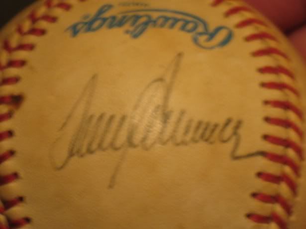 Now the good stuff. I got a low numbered series 1989 UD unopened box AND a high numbered box for $25 ($12.50 each). I'm currently now deciding whether to bust the 1989 UD and try for a Griffey high grade or sell it. If that wasn't enough, however, the best was yet to come. I walked by this table with a lot of different stuff, and I noticed a ball and a glove. I looked at the glove first and it was nothing special, but I notice side of the ball and could see "official ball: American League" on it, so I picked it up to see how much they wanted for it. That's when I saw the signature (and by the title of the thread, you probably know what's coming). I asked them how much they wanted for it, and the guy said that since he had no idea who signed it, he'd take $5. I handed him his money and walked away with an official American League baseball (Bobby Brown pres.) autographed Tom "Terrific Seaver. So yeah, good day at the flea market!! |
