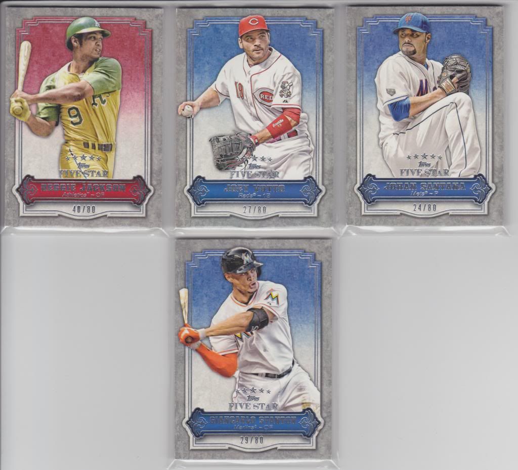 Please include 2 dollars for shipping. #/80 Reggie Jackson - 14 Giancarlo Stanton - 14 CC Sabathia - 10 Roberto Clemente - 14Joey Votto - 14 Johan Santana - 8 Andrew McCutchen - 10 Jose Bautista - 8 #/10 Hanley Ramirez - 22 Scans available upon request. ![]()